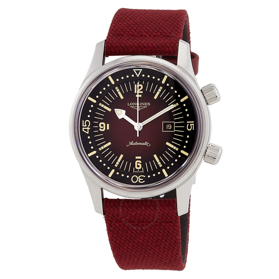 Silver-tone stainless steel case with a bordeaux synthetic band. Bi-directional rotating silver-tone stainless steel bezel. Bordeaux dial with silver-tone hands and index-Arabic numeral hour markers. Minute markers around the outer rim. Dial Type: Analog. Luminescent hands and markers. Date display at the 3 o'clock position. Longines Calibre L592 Automatic movement, based upon ETA A20.L01, containing 22 Jewels, bitting at 28800 vph, and has a power reserve of approximately 40 hours. Scratch resistant sapphire crystal. Screw down crown. Solid case back. Round case shape, case size: 36 mm, case thickness: 11.9 mm. Band width: 19 mm. Buckle clasp. Water resistant at 300 meters / 1000 feet. Functions: date, hour, minute, second. Additional Info: original box, international warranty card, manual (complete accessories). Legend Diver Series. Luxury watch style. Watch label: Swiss Made. Longines Legend Diver Automatic Bordeaux Dial Ladies Watch L3.374.4.40.2. CASE Case Size: 36 Case Thickness: 11.9 mm Case Material: Stainless Steel Case Shape: Round Case Back: Solid BAND Band Material: Synthetic Band Type: Strap Band Color: Bordeaux Band Width: 19 mm Clasp: Buckle DIAL Dial Color: Bordeaux Type: Analog Crystal: Scratch Resistant Sapphire Hands: Silver-tone Dial Markers: Index-Arabic Numeral Second Markers: Minute Markers around the outer rim Luminiscence: Hands and Markers Bezel: Bi-directional Rotating Bezel Color: Silver-tone Bezel Material: Stainless Steel Crown: Screw Down INFORMATION Brand: Longines Series: Legend Diver Collection Name: Legend Diver Gender: Womens Model: L3.374.4.40.2 Watch Label: Swiss Made Movement: Automatic Engine: Longines Calibre L592 Power Reserve: 40 hours FEATURES Water Resistance: 300 meters / 1000 feet Calendar: Date display at the 3 o'clock position Functions: Date, Hour, Minute, Second Watch Features: Stainless Steel, Analog ADDITIONAL INFO Watch Style: Luxury Warranty: 2 Year Jomashop Warranty Additional Info: Original Box, Manual (Complete Accessories) Jomashop Sku: LNG33744402 Department: Watches