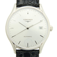 Silver-tone stainless steel case with a black leather strap. Fixed silver-tone stainless steel bezel. Silver-tone dial with silver-tone hands and index hour markers. Minute markers around the outer rim. Dial Type: Analog. Date display at the 3 o'clock position. Longines Calibre L619 Automatic movement, based upon ETA 2892-A2, containing 21 Jewels, bitting at 28800 vph, and has a power reserve of approximately 42 hours. Scratch resistant sapphire crystal. Transparent see through case back. Round case shape, case size: 35 mm. Band width: 18 mm. Buckle clasp. Water resistant at 30 meters / 100 feet. Functions: date, hour, minute, second. Additional Info: original box, international warranty card, manual (complete accessories). Lyre Series. Luxury watch style. Watch label: Swiss Made. Longines Lyre Automatic Silver Dial Ladies Watch L4.860.4.72.2. GENERAL Box Type: Original Box CASE Case Size: 35 Case Material: Stainless Steel Case Shape: Round Case Back: Transparent See Through BAND Band Material: Leather Band Type: Strap Band Color: Black Band Width: 18 mm Clasp: Buckle DIAL Dial Color: Silver-tone Type: Analog Crystal: Scratch Resistant Sapphire Hands: Silver-tone Dial Markers: Index Second Markers: Minute Markers around the outer rim Bezel: Fixed Bezel Color: Silver-tone Bezel Material: Stainless Steel INFORMATION Brand: Longines Series: Lyre Collection Name: Lyre Gender: Womens Model: L4.860.4.72.2 Watch Label: Swiss Made Movement: Automatic Engine: Longines Calibre L619 Power Reserve: 42 hours FEATURES Water Resistance: 30 meters / 100 feet Calendar: Date display at the 3 o'clock position Functions: Date, Hour, Minute, Second Watch Features: Analog, Leather, Stainless Steel ADDITIONAL INFO Watch Style: Luxury Warranty: 2 Year Jomashop Warranty Additional Info: Original Box, Manual (Complete Accessories) Jomashop Sku: LNG48604722 Department: Watches Category: Watches