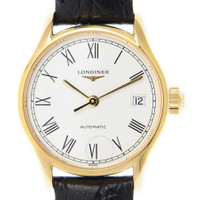 Yellow gold-tone stainless steel case with a black alligator band. Fixed yellow gold-tone stainless steel bezel. White dial with yellow gold-tone hands and Roman numeral hour markers. Minute markers around the outer rim. Dial Type: Analog. Date display at the 3 o'clock position. Longines Calibre L595 Automatic movement, based upon ETA 2000/1, containing 20 Jewels, bitting at 28800 vph, and has a power reserve of approximately 40 hours. Scratch resistant sapphire crystal. Transparent see through case back. Round case shape, case size: 25 mm, case thickness: 8 mm. Band width: 13 mm. Buckle clasp. Water resistant at 30 meters / 100 feet. Functions: date, hour, minute, second. Additional Info: original box, international warranty card, manual (complete accessories). Lyre Series. Luxury watch style. Watch label: Swiss Made. Longines Lyre Automatic White Dial Ladies Watch L4.360.2.11.2. GENERAL Box Type: Original Box CASE Case Size: 25 Case Thickness: 8 mm Case Material: Stainless Steel Case Shape: Round Case Back: Transparent See Through BAND Band Material: Alligator Band Type: Strap Band Color: Black Band Width: 13 mm Clasp: Buckle DIAL Dial Color: White Type: Analog Crystal: Scratch Resistant Sapphire Hands: Yellow Gold-tone Dial Markers: Roman Numeral Second Markers: Minute Markers around the outer rim Bezel: Fixed Bezel Color: Yellow Gold-tone Bezel Material: Stainless Steel INFORMATION Brand: Longines Series: Lyre Collection Name: Lyre Gender: Womens Model: L4.360.2.11.2 Watch Label: Swiss Made Movement: Automatic Engine: Longines Calibre L595 Power Reserve: 40 hours FEATURES Water Resistance: 30 meters / 100 feet Calendar: Date display at the 3 o'clock position Functions: Date, Hour, Minute, Second Watch Features: Alligator Leather, Analog, Gold, Stainless Steel ADDITIONAL INFO Watch Style: Luxury Warranty: 2 Year Jomashop Warranty Additional Info: Original Box, Manual (Complete Accessories) Jomashop Sku: LNG43602112 Department: Watches Category: Watches