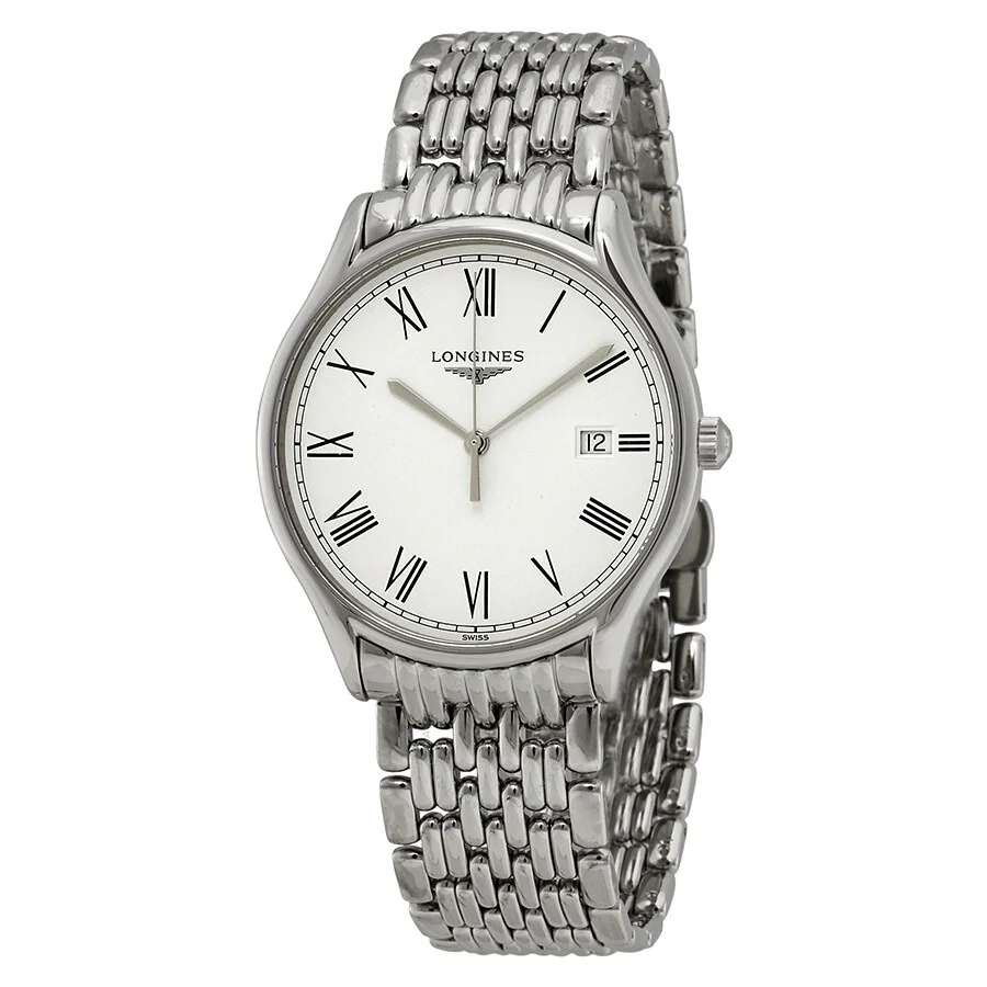 Silver-tone stainless steel case with a silver-tone stainless steel bracelet. Fixed silver-tone stainless steel bezel. White dial with polished silver-tone hands and Roman numeral hour markers. Dial Type: Analog. Date display at the 3 o'clock position. Longines Calibre L157 quartz movement. Scratch resistant sapphire crystal. Round case shape. Case size: 38.5 mm. Fold over with safety release clasp. Water resistant at 30 meters / 100 feet. Functions: date, hour, minute, second. Casual watch style. Watch label: Swiss Made. Longines Lyre White Dial Men's Watch L4.859.4.11.6. GENERAL Box Type: Original Box CASE Case Size: 38 Case Material: Stainless Steel Case Shape: Round BAND Band Material: Stainless Steel Band Type: Bracelet Band Color: Silver-tone Clasp: Fold Over with Safety Release DIAL Dial Color: White Type: Analog Crystal: Scratch Resistant Sapphire Hands: Polished Silver-tone Dial Markers: Roman Numeral Bezel: Fixed Bezel Color: Silver-tone Bezel Material: Stainless Steel INFORMATION Brand: Longines Series: Lyre Collection Name: Lyre Gender: Mens Model: L4.859.4.11.6 Watch Label: Swiss Made Movement: Quartz Engine: Longines Calibre L157 FEATURES Water Resistance: 30 meters / 100 feet Calendar: Date display at the 3 o'clock position Functions: Date, Hour, Minute, Second Watch Features: Analog, Stainless Steel ADDITIONAL INFO Watch Style: Casual Warranty: 2 Year Jomashop Warranty UPC Code: 7612356189518 Jomashop Sku: LNG48594116 Department: Watches Category: Watches