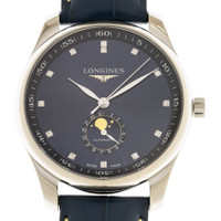 Silver-tone stainless steel case with a blue alligator band. Fixed silver-tone stainless steel bezel. Blue dial with silver-tone hands and diamond hour markers. Minute markers around the outer rim. Dial Type: Analog. Date display at the 6 o'clock position. Automatic movement. Scratch resistant sapphire crystal. Transparent see through case back. Round case shape, case size: 42 mm. Deployment with push button release clasp. Water resistant at 30 meters / 100 feet. Functions: date, hour, minute, second. Additional Info: original box, international warranty card, manual (complete accessories). Master Series. Luxury watch style. Watch label: Swiss Made. Longines Master Automatic Diamond Blue Dial Men's Watch L2.919.4.97.0. GENERAL Box Type: Original Box CASE Case Size: 42 Case Material: Stainless Steel Case Shape: Round Case Back: Transparent See Through BAND Band Material: Alligator Band Type: Strap Band Color: Blue Clasp: Deployment with Push Button Release DIAL Dial Color: Blue Type: Analog Crystal: Scratch Resistant Sapphire Hands: Silver-tone Dial Markers: Diamond Second Markers: Minute Markers around the outer rim Bezel: Fixed Bezel Color: Silver-tone Bezel Material: Stainless Steel INFORMATION Brand: Longines Series: Master Collection Name: Master Gender: Mens Model: L2.919.4.97.0 Watch Label: Swiss Made Movement: Automatic FEATURES Water Resistance: 30 meters / 100 feet Calendar: Date display at the 6 o'clock position Functions: Date, Hour, Minute, Second Watch Features: Alligator Leather, Analog, Stainless Steel, Diamond ADDITIONAL INFO Watch Style: Luxury Warranty: 2 Year Jomashop Warranty Additional Info: Original Box, Manual (Complete Accessories) Jomashop Sku: LNG29194970 Department: Watches Category: Watches