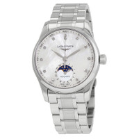 Stainless steel case with a stainless steel bracelet. Fixed stainless steel bezel. Mother of pearl dial with silver-tone hands and diamond hour markers. Arabic numeral minute markers (at 5 minute intervals). Minute markers around the outer rim. Dial Type: Analog. Date display at the 6 o'clock position. Date / moonphase sub-dial. Longines calibre L899 automatic movement, based upon ETA A31.L91, containing 21 Jewels, bitting at 25200 vph, and has a power reserve of approximately 64 hours. Scratch resistant sapphire crystal. Pull / push crown. Transparent case back. Round case shape. Case size: 34 mm. Case thickness: 11.1 mm. Band width: 18 mm. Fold over clasp. Water resistant at 30 meters / 100 feet. Functions: moon phase, date, hour, minute, second. Additional Info: original box, manual (complete accessories). Master Series. Luxury watch style. Watch label: Swiss Made. Longines Master Automatic Diamond Mother of Pearl Dial Ladies Watch L2.409.4.87.6. INFORMATION Brand: Longines Series: Master Collection Name: Master Gender: Womens Model: L2.409.4.87.6 Watch Label: Swiss Made Movement: Automatic Engine: Longines Calibre L899 Power Reserve: 64 hours CASE Case Size: 34 mm Case Thickness: 11.1 mm Case Material: Stainless Steel Case Shape: Round Case Back: Transparent BAND Band Material: Stainless Steel Band Type: Bracelet Band Color: Silver-tone Band Width: 18 mm Clasp: Fold Over DIAL Dial Color: Mother of Pearl Type: Analog Crystal: Scratch Resistant Sapphire Hands: Silver-tone Dial Markers: Diamond Second Markers: Arabic Numeral Minute Markers (at 5 minute intervals). Minute Markers around the outer rim Sub Dials: Date / Moonphase Bezel: Fixed Bezel Color: Silver-tone Bezel Material: Stainless Steel Crown: Pull / Push FEATURES Water Resistance: 30 meters / 100 feet Calendar: Date display at the 6 o'clock position Functions: Moon Phase, Date, Hour, Minute, Second Watch Features: Diamond, Moon Phase, Stainless Steel, Analog ADDITIONAL INFO Watch Style: Luxury Warranty: 2 Year Jomashop Warranty UPC Code: 7612356219659 Additional Info: Original Box, Manual (Complete Accessories) Jomashop Sku: LNG24094876 Department: Watches Category: Watches