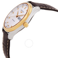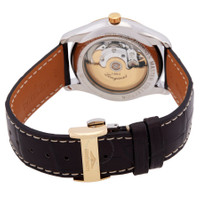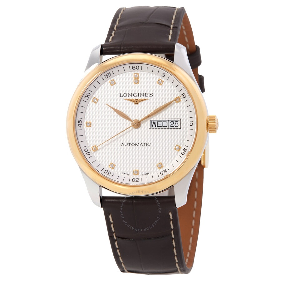 Silver-tone stainless steel case with a brown alligator band. Fixed yellow gold-tone stainless steel bezel. White dial with yellow gold-tone hands and diamond hour markers. Minute markers around the outer rim. Dial Type: Analog. Day of the week and date display at the 3 o'clock position. Automatic movement. Scratch resistant sapphire crystal. Pull / push crown. Round case shape, case size: 38.5 mm. Fold over clasp. Water resistant at 30 meters / 100 feet. Functions: date, day, hour, minute, second. Master Series. Luxury watch style. Watch label: Swiss Made. Longines Master Automatic Diamond White Dial Men's Watch L2.755.5.77.3. GENERAL Box Type: Original Box CASE Case Material: Stainless Steel Case Shape: Round Case Back: Transparent See Through BAND Band Material: Alligator Band Type: Strap Band Color: Brown Clasp: Fold Over DIAL Dial Color: White Type: Analog Crystal: Scratch Resistant Sapphire Hands: Yellow Gold-tone Dial Markers: Diamond Second Markers: Minute Markers around the outer rim Bezel: Fixed Bezel Color: Yellow Gold-tone Bezel Material: Stainless Steel Crown: Pull / Push INFORMATION Brand: Longines Series: Master Collection Name: Master Gender: Mens Model: L2.755.5.77.3 Watch Label: Swiss Made Movement: Automatic FEATURES Water Resistance: 30 meters / 100 feet Calendar: Day of the Week and Date display at the 3 o'clock position Functions: Date, Day, Hour, Minute, Second Watch Features: Alligator Leather, Analog, Gold, Stainless Steel, Diamond ADDITIONAL INFO Watch Style: Luxury Warranty: 2 Year Jomashop Warranty Jomashop Sku: LNG27555773 Department: Watches