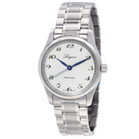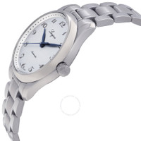 Silver-tone stainless steel case and bracelet. Fixed silver-tone stainless steel bezel. Silver dial with blue hands and Arabic numeral hour markers. Minute markers around the outer rim. Dial Type: Analog. Longines Calibre L888 Automatic movement, based upon ETA A31.L11, containing 21 Jewels, bitting at 25200 vph, and has a power reserve of approximately 64 hours. Scratch resistant sapphire crystal. Pull / push crown. Transparent see through case back. Round case shape, case size: 34 mm, case thickness: 9.2 mm. Band width: 18 mm. Fold over clasp with a safety release. Water resistant at 30 meters / 100 feet. Functions: hour, minute, second. Master Series. Dress watch style. Watch label: Swiss Made. Longines Master Automatic Silver Dial Ladies Watch L23574736. GENERAL Box Type: Original Box CASE Case Thickness: 9.2 mm Case Material: Stainless Steel Case Shape: Round Case Back: Transparent See Through BAND Band Material: Stainless Steel Band Type: Bracelet Band Color: Silver-tone Band Width: 18 mm Clasp: Fold Over with Safety Release DIAL Dial Color: Silver Type: Analog Crystal: Scratch Resistant Sapphire Hands: Blue Dial Markers: Arabic Numeral Second Markers: Minute Markers around the outer rim Bezel: Fixed Bezel Color: Silver-tone Bezel Material: Stainless Steel Crown: Pull / Push INFORMATION Brand: Longines Series: Master Collection Name: Master Gender: Womens Model: L23574736 Watch Label: Swiss Made Movement: Automatic Engine: Longines Calibre L888 FEATURES Water Resistance: 30 meters / 100 feet Functions: Hour, Minute, Second Watch Features: Stainless Steel, Analog ADDITIONAL INFO Watch Style: Dress Warranty: 2 Year Jomashop Warranty Jomashop Sku: LNG23574736 Department: Watches