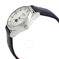 Silver-tone stainless steel case with a blue alligator leather strap. Fixed silver-tone stainless steel bezel. White mother of pearl dial with silver-tone hands and diamond hour markers. Arabic numeral minute markers (at 5 minute intervals). Dial Type: Analog. Date display at the 6 o'clock position. One subdial displaying: date/moonphase. Longines Calibre L899 Automatic movement, based upon ETA A31.L91, containing 21 Jewels, bitting at 25200 vph, and has a power reserve of approximately 64 hours. Scratch resistant sapphire crystal. Pull / push crown. Transparent case back. Round case shape, case size: 34 mm, case thickness: 11.1 mm. Band width: 18 mm. Fold over clasp with a safety release. Water resistant at 30 meters / 100 feet. Functions: moon phase, date, hour, minute, second. Additional Info: dial set with 12 top wesselton vs-si diamonds, for a total of 0.055 carats. Master Collection Series. Dress watch style. Watch label: Swiss Made. Longines Master Collection Automatic Diamond White Mother of Pearl Dial Ladies Watch L24094870. INFORMATION Brand: Longines Series: Master Collection Collection Name: Master Collection Gender: Womens Model: L24094870 Watch Label: Swiss Made Movement: Automatic Engine: Longines Calibre L899 Power Reserve: 64 hours CASE Case Size: 34 mm Case Thickness: 11.1 mm Case Material: Stainless Steel Case Shape: Round Case Back: Transparent BAND Band Material: Alligator Leather Band Type: Strap Band Color: Blue Band Width: 18 mm Clasp: Fold Over with Safety Release DIAL Dial Color: White Mother of Pearl Type: Analog Crystal: Scratch Resistant Sapphire Hands: Silver-tone Dial Markers: Diamond Second Markers: Arabic Numeral Minute Markers (at 5 minute intervals) Sub Dials: One - Date/Moonphase Bezel: Fixed Bezel Color: Silver-tone Bezel Material: Stainless Steel Crown: Pull / Push FEATURES Water Resistance: 30 meters / 100 feet Calendar: Date display at the 6 o'clock position Functions: Moon Phase, Date, Hour, Minute, Second Watch Features: Alligator Leather, Analog, Leather, Stainless Steel, Moon Phase, Diamond ADDITIONAL INFO Watch Style: Dress Warranty: 2 Year Jomashop Warranty Additional Info: Dial set with 12 Top Wesselton VS-SI diamonds, for a total of 0.055 carats Jomashop Sku: LNG24094870 Department: Watches Category: Watches