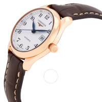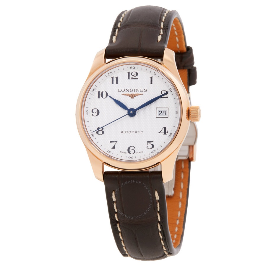 18kt rose gold case with a brown alligator/crocodile leather strap. Fixed bezel. Silver dial. Dial Type: Analog. Longines Calibre L595 Automatic movement, based upon ETA 2000/1, containing 20 Jewels, bitting at 28800 vph, and has a power reserve of approximately 40 hours. Scratch resistant sapphire crystal. Pull / push crown. Transparent case back. Round case shape, case size: 29 mm, case thickness: 9 mm. Deployant buckle clasp. Water resistant at 30 meters / 100 feet. Functions: date, hour, minute, second. Master Collection Series. Watch label: Swiss Made. Longines Master Collection Automatic Silver Dial Ladies Watch L2.257.8.78.3. GENERAL Box Type: Original Box CASE Case Diameter: 29 mm Case Thickness: 9 mm Case Material: 18kt Rose Gold Case Shape: Round Case Back: Transparent BAND Band Material: Alligator/Crocodile Leather Band Type: Strap Band Color: Brown Clasp: Deployant Buckle DIAL Dial Color: Silver Type: Analog Crystal: Scratch Resistant Sapphire Hands: Blue Dial Markers: Arabic Numeral Second Markers: Minute Markers around the outer rim Bezel: Fixed Bezel Color: Rose Gold-tone Bezel Material: 18kt Rose Gold Crown: Pull / Push INFORMATION Brand: Longines Series: Master Collection Collection Name: Master Collection Gender: Womens Model: L2.257.8.78.3 Watch Label: Swiss Made Movement: Automatic Engine: Longines Calibre L595 Power Reserve: 40 hours FEATURES Water Resistance: 30 meters / 100 feet Calendar: Date display at the 3 o'clock position Functions: Date, Hour, Minute, Second Watch Features: Alligator Leather, Analog, Gold, Leather ADDITIONAL INFO Warranty: 2 Year Jomashop Warranty UPC Code: 7612356175795 Jomashop Sku: LNG22578783 Department: Watches Category: Watches