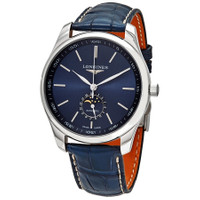 Stainless steel case with a blue (alligator) leather strap. Fixed stainless steel bezel. Blue dial with silver-tone hands and index hour markers. Arabic numeral minute markers (at 5 minute intervals). Minute markers around the outer rim. Dial Type: Analog. Date display at the 6 o'clock position. Combination: date and moon phase sub-dial. Longines calibre L899 automatic movement, based upon ETA A31.L91, containing 21 Jewels, bitting at 25200 vph, and has a power reserve of approximately 64 hours. Scratch resistant sapphire crystal. Pull / push crown. Transparent case back. Round case shape. Case size: 42 mm. Band width: 21 mm. Deployment clasp. Water resistant at 30 meters / 100 feet. Functions: date, hour, minute, second, moonphase. Additional Info: original box, manual (complete accessories). Master Collection Series. Dress watch style. Watch label: Swiss Made. Longines Master Collection Moonphase Automatic Blue Dial Men's Watch L29194920. INFORMATION Brand: Longines Series: Master Collection Collection Name: Master Collection Gender: Mens Model: L29194920 Watch Label: Swiss Made Movement: Automatic Engine: Longines Calibre L899 Power Reserve: 64 hours CASE Case Size: 42 mm Case Material: Stainless Steel Case Shape: Round Case Back: Transparent BAND Band Material: (Alligator) Leather Band Type: Strap Band Color: Blue Band Width: 21 mm Clasp: Deployment DIAL Dial Color: Blue Type: Analog Crystal: Scratch Resistant Sapphire Hands: Silver-tone Dial Markers: Index Second Markers: Arabic Numeral Minute Markers (at 5 minute intervals). Minute Markers around the outer rim Sub Dials: Combination: Date and Moon Phase Bezel: Fixed Bezel Color: Silver-tone Bezel Material: Stainless Steel Crown: Pull / Push FEATURES Water Resistance: 30 meters / 100 feet Calendar: Date display at the 6 o'clock position Functions: Date, Hour, Minute, Second, Moonphase Watch Features: Moon Phase, Stainless Steel, Leather, Analog, Alligator Leather ADDITIONAL INFO Watch Style: Dress Warranty: 2 Year Jomashop Warranty UPC Code: 703200206912 Additional Info: Original Box, Manual (Complete Accessories) Jomashop Sku: LNG29194920 Department: Watches Category: Watches