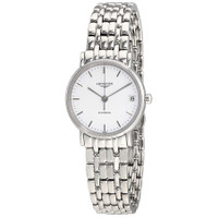 Stainless steel case with a stainless steel bracelet. Fixed stainless steel bezel. White dial with silver-tone hands and index hour markers. Minute markers around the outer rim. Dial Type: Analog. Date display at the 3 o'clock position. Longines calibre L619/888 automatic movement, based upon ETA 2892, containing 21 Jewels, bitting at 25200 vph, and has a power reserve of approximately 64 hours. Scratch resistant sapphire crystal. Pull / push crown. Transparent case back. Round case shape. Case size: 30 mm. Band width: 16 mm. Fold over clasp with a push button release. Water resistant at 30 meters / 100 feet. Functions: date, hour, minute, second. Presence Series. Casual watch style. Watch label: Swiss Made. Longines Presence Automatic White Dial Ladies Watch L43224126. INFORMATION Brand: Longines Series: Presence Collection Name: Presence Gender: Womens Model: L43224126 Watch Label: Swiss Made Movement: Automatic Engine: Longines Calibre L619/888 Power Reserve: 42 hours CASE Case Size: 30 mm Case Material: Stainless Steel Case Shape: Round Case Back: Transparent BAND Band Material: Stainless Steel Band Type: Bracelet Band Color: Silver-tone Band Width: 16 mm Clasp: Fold Over DIAL Dial Color: White Type: Analog Crystal: Scratch Resistant Sapphire Hands: Silver-tone Dial Markers: Index Second Markers: Minute Markers around the outer rim Bezel: Fixed Bezel Color: Silver-tone Bezel Material: Stainless Steel Crown: Pull / Push FEATURES Water Resistance: 30 meters / 100 feet Calendar: Date display at the 3 o'clock position Functions: Date, Hour, Minute, Second Watch Features: Stainless Steel, Analog ADDITIONAL INFO Watch Style: Casual Warranty: 2 Year Jomashop Warranty UPC Code: 842047115909 Jomashop Sku: LNG43224126 Department: Watches Category: Watches