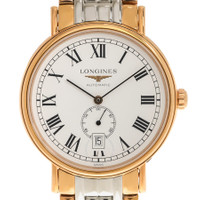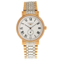 Stainless steel case with a two-tone (silver-tone and rose gold PVD) stainless steel bracelet. Fixed rose gold PVD bezel. White dial with black hands and Roman numeral hour markers. Minute markers around the outer rim. Dial Type: Analog. Date display at the 3 o'clock position. One subdial displaying: small seconds. Longines calibre L892 automatic movement with a 64-hour power reserve. Scratch resistant sapphire crystal. Pull / push crown. Transparent case back. Round case shape. Case size: 40 mm. Band width: 18 mm. Deployment clasp with a push button release. Water resistant at 30 meters / 100 feet. Functions: date, hour, minute, second. Additional Info: original box, manual (complete accessories). Presence Series. Luxury watch style. Watch label: Swiss Made. Longines Presence Automatic White Dial Men's Watch L4.905.1.11.7. GENERAL Box Type: Original Box CASE Case Size: 40 Case Material: Stainless Steel Case Shape: Round Case Back: Transparent BAND Band Material: Stainless Steel Band Type: Bracelet Band Color: Two-tone (Silver-tone and Rose Gold PVD) Band Width: 18 mm Clasp: Deployment with Push Button Release DIAL Dial Color: White Type: Analog Crystal: Scratch Resistant Sapphire Hands: Black Dial Markers: Roman Numeral Second Markers: Minute Markers around the outer rim Sub Dials: Small Seconds Bezel: Fixed Bezel Color: Rose Gold PVD Bezel Material: Stainless Steel Crown: Pull / Push INFORMATION Brand: Longines Series: Presence Collection Name: Presence Gender: Mens Model: L4.905.1.11.7 Watch Label: Swiss Made Movement: Automatic Engine: Longines Calibre L892 Power Reserve: 64 hours FEATURES Water Resistance: 30 meters / 100 feet Calendar: Date display at the 3 o'clock position Functions: Date, Hour, Minute, Second Watch Features: Analog, Gold, Stainless Steel ADDITIONAL INFO Watch Style: Luxury Warranty: 2 Year Jomashop Warranty UPC Code: 7612356209681 Additional Info: Original Box, Manual (Complete Accessories) Jomashop Sku: LNG49051117 Department: Watches Category: Watches