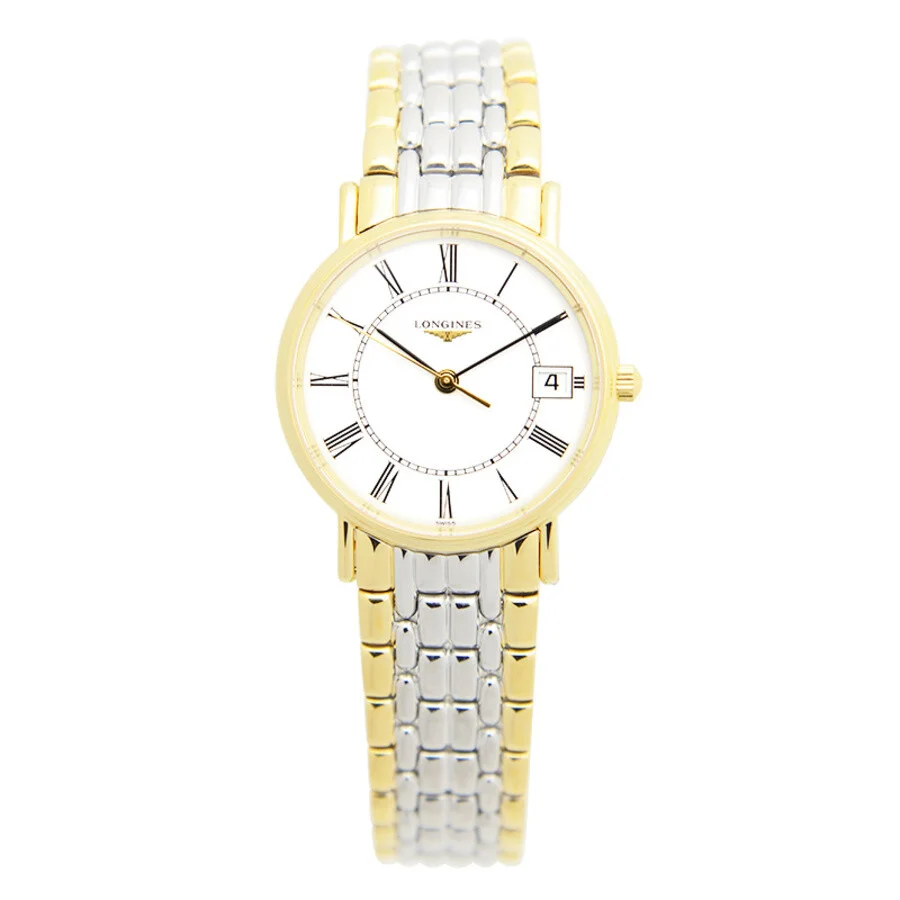 Yellow gold-tone stainless steel case with a two-tone (silver-tone and yellow gold-tone) stainless steel bracelet. Fixed yellow gold-tone stainless steel bezel. Yellow gold-tone hands and Roman numeral hour markers. Minute scale around the inner rim. Dial Type: Analog. Date display at the 3 o'clock position. Longines Calibre L156 quartz movement. Scratch resistant sapphire crystal. Solid case back. Round case shape, case size: 30 mm. Deployment with push button release clasp. Water resistant at 30 meters / 100 feet. Functions: date, hour, minute, second. Presence Series. Luxury watch style. Watch label: Swiss Made. Longines Presence Quartz Ladies Watch L4.320.2.11.7. GENERAL Box Type: Original Box CASE Case Diameter: 30 mm Case Material: Stainless Steel Case Shape: Round Case Back: Solid BAND Band Material: Stainless Steel Band Type: Bracelet Band Color: Two-tone (Silver-tone and Yellow Gold-tone) Clasp: Deployment with Push Button Release DIAL Dial Color: White Type: Analog Crystal: Scratch Resistant Sapphire Hands: Yellow Gold-tone Dial Markers: Roman Numeral Second Markers: Minute Scale around the inner rim Bezel: Fixed Bezel Color: Yellow Gold-tone Bezel Material: Stainless Steel INFORMATION Brand: Longines Series: Presence Collection Name: Presence Gender: Womens Model: L4.320.2.11.7 Watch Label: Swiss Made Movement: Quartz Engine: Longines Calibre L156 FEATURES Water Resistance: 30 meters / 100 feet Calendar: Date display at the 3 o'clock position Functions: Date, Hour, Minute, Second Watch Features: Analog, Gold, Stainless Steel ADDITIONAL INFO Watch Style: Luxury Warranty: 2 Year Jomashop Warranty UPC Code: 7612356189105 Additional Info: Original Box, Manual (Complete Accessories) Jomashop Sku: LNG43202117 Department: Watches Category: Watches