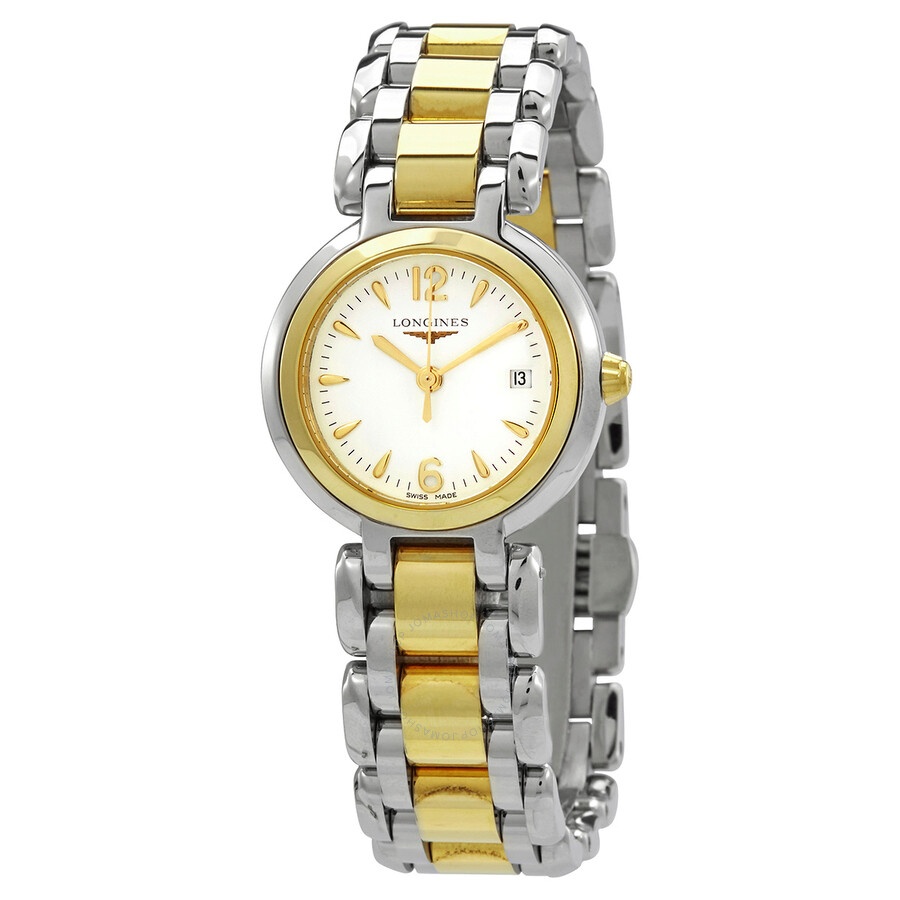 Stainless steel case with a two-tone (silver-tone and 18kt yellow gold-capped) stainless steel bracelet. Fixed silver-tone and 18kt yellow gold-capped bezel. White dial with yellow gold-tone hands and index hour markers. Arabic numerals appear at the 6 and 12 o'clock positions. Minute markers around the outer rim. Dial Type: Analog. Date display at the 3 o'clock position. Quartz movement. Scratch resistant sapphire crystal. Pull / push crown. Solid case back. Round case shape. Case size: 26.5 mm. Deployment clasp. Water resistant at 30 meters / 100 feet. Functions: date, hour, minute, second. Primaluna Series. Dress watch style. Watch label: Swiss Made. Longines PrimaLuna Quartz White Dial Ladies Watch L8.110.5.90.6. INFORMATION Brand: Longines Series: Primaluna Collection Name: PrimaLuna Gender: Womens Model: L8.110.5.90.6 Watch Label: Swiss Made Movement: Quartz CASE Case Size: 26.5 mm Case Material: Stainless Steel Case Shape: Round Case Back: Solid BAND Band Material: Stainless Steel Band Type: Bracelet Band Color: Two-tone (Silver-tone and 18kt Yellow Gold-capped) Clasp: Deployment DIAL Dial Color: White Type: Analog Crystal: Scratch Resistant Sapphire Hands: Yellow Gold-tone Dial Markers: Index Second Markers: Arabic Numerals appear at the 6 and 12 o'clock positions. Minute Markers around the outer rim Bezel: Fixed Bezel Color: Silver-tone and 18kt Yellow Gold-capped Bezel Material: Stainless Steel Crown: Pull / Push FEATURES Water Resistance: 30 meters / 100 feet Calendar: Date display at the 3 o'clock position Functions: Date, Hour, Minute, Second Watch Features: Stainless Steel, Gold, Analog ADDITIONAL INFO Watch Style: Dress Warranty: 2 Year Jomashop Warranty Jomashop Sku: LNG81105906 Department: Watches Category: Watches