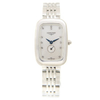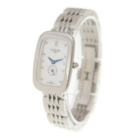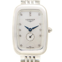 Silver-tone stainless steel case and bracelet. Fixed bezel. Mother of pearl dial with blue hands and diamond hour markers. Dial Type: Analog. One subdial displaying: one- small seconds. Longines Calibre L178 quartz movement. Scratch resistant sapphire crystal. Pull / push crown. Solid case back. Square case shape, case size: 32 mm x 22 mm. Water resistant at 30 meters / 100 feet. Functions: hour, minute, second. Casual watch style. Watch label: Swiss Made. Longines Quartz Diamond Ladies Watch L6.141.4.87.6. INFORMATION Brand: Longines Gender: Womens Model: L6.141.4.87.6 Watch Label: Swiss Made Movement: Quartz Engine: Longines Calibre L178 CASE Case Size: 32 mm x 22 mm Case Material: Stainless Steel Case Shape: Square Case Back: Solid BAND Band Material: Stainless Steel Band Type: Bracelet Band Color: Silver-tone Clasp: Deployment with Push Button Release DIAL Dial Color: Mother of Pearl Type: Analog Crystal: Scratch Resistant Sapphire Hands: Blue Dial Markers: Diamond Sub Dials: One- Small Seconds Bezel: Fixed Bezel Color: Silver-tone Bezel Material: Stainless Steel Crown: Pull / Push FEATURES Water Resistance: 30 meters / 100 feet Functions: Hour, Minute, Second Watch Features: Diamond, Stainless Steel, Analog ADDITIONAL INFO Watch Style: Casual Warranty: 2 Year Jomashop Warranty Jomashop Sku: LNG61414876 Department: Watches Category: Watches