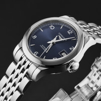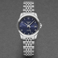 Silver-tone stainless steel case and bracelet. Fixed silver-tone bezel. Blue dial with silver-tone hands and Arabic numeral, index hour markers. Dial Type: Analog. Date display at the 3 o'clock position. Longines Calibre L592.4 Automatic movement, based upon ETA A20.L11, containing 22 Jewels, bitting at 28800 vph, and has a power reserve of approximately 40 hours. Scratch resistant sapphire crystal. Transparent see through case back. Round case shape, case size: 26 mm. Deployment clasp. Water resistant at 30 meters / 100 feet. Functions: date, hour, minute, second. Record Series. Watch label: Swiss Made. Longines Record Automatic Blue Dial Ladies Watch L23204966. GENERAL Box Type: Original Box CASE Case Diameter: 26 Case Material: Stainless Steel Case Shape: Round Case Back: Transparent See Through BAND Band Material: Stainless Steel Band Type: Bracelet Band Color: Silver-tone Clasp: Deployment DIAL Dial Color: Blue Type: Analog Crystal: Scratch Resistant Sapphire Hands: Silver-tone Dial Markers: Arabic Numeral, Index Bezel: Fixed Bezel Color: Silver-tone Bezel Material: Stainless Steel INFORMATION Brand: Longines Series: Record Collection Name: Record Gender: Womens Model: L2.320.4.96.6 Watch Label: Swiss Made Movement: Automatic Engine: Longines Calibre L592.4 FEATURES Water Resistance: 30 meters / 100 feet Calendar: Date display at the 3 o'clock position Functions: Date, Hour, Minute, Second Watch Features: Stainless Steel, Analog ADDITIONAL INFO Warranty: 2 Year Jomashop Warranty UPC Code: 7612356201630 Jomashop Sku: LNG23204966 Department: Watches Category: Watches