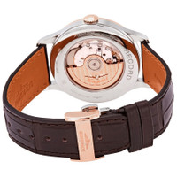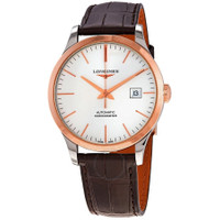 Stainless steel case with a brown (alligator) leather strap. Fixed 18kt rose gold (cap) bezel. Silver dial with rose gold-tone hands and index hour markers. Minute markers around the outer rim. Dial Type: Analog. Date display at the 3 o'clock position. Longines calibre L888.4 automatic movement, based upon ETA A31.L11, containing 21 Jewels, bitting at 25200 vph, and has a power reserve of approximately 64 hours. Scratch resistant sapphire crystal. Pull / push crown. Transparent case back. Round case shape. Case size: 40 mm. Band width: 20 mm. Triple fold over clasp with a safety release. Water resistant at 30 meters / 100 feet. Functions: date, hour, minute, second, chronometer. Record Series. Luxury watch style. Watch label: Swiss Made. Longines Record Automatic Chronometer Silver Dial Men's Watch L28215722. INFORMATION Brand: Longines Series: Record Collection Name: Record Gender: Mens Model: L28215722 Watch Label: Swiss Made Movement: Automatic Engine: Longines Calibre L888.4 Power Reserve: 64 hours CASE Case Size: 40 mm Case Material: Stainless Steel Case Shape: Round Case Back: Transparent BAND Band Material: (Alligator) Leather Band Type: Strap Band Color: Brown Band Width: 20 mm Clasp: Triple Fold Over with Safety Release DIAL Dial Color: Silver Type: Analog Crystal: Scratch Resistant Sapphire Hands: Rose Gold-tone Dial Markers: Index Second Markers: Minute Markers around the outer rim Bezel: Fixed Bezel Color: Rose Gold Bezel Material: 18kt Rose Gold (Cap) Crown: Pull / Push FEATURES Water Resistance: 30 meters / 100 feet Calendar: Date display at the 3 o'clock position Functions: Date, Hour, Minute, Second, Chronometer Watch Features: Alligator Leather, Analog, Chronometer, Gold, Leather, Stainless Steel ADDITIONAL INFO Watch Style: Luxury Warranty: 2 Year Jomashop Warranty UPC Code: 703200204635 Jomashop Sku: LNG28215722 Department: Watches Category: Watches