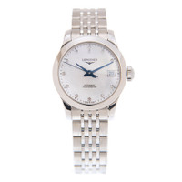 Silver-tone stainless steel case with a brushed & polished stainless steel bracelet. Fixed stainless steel bezel. Mother of pearl dial with blue hands and diamond hour markers. Dial Type: Analog. Date display at the 3 o'clock position. Automatic movement. Anti-reflective scratch resistant sapphire crystal. Pull / push crown. Transparent case back. Round case shape, case size: 26 mm. Band width: 13 mm. Push button folding clasp. Water resistant at 30 meters / 99 feet. Functions: date, hour, minute, second. Record Series. Dress watch style. Watch label: Swiss Made. Record Automatic Diamond Ladies Watch L23204876. CASE Case Size: 26 Case Material: Stainless Steel Case Shape: Round Case Back: Transparent BAND Band Material: Stainless Steel Band Type: Bracelet Band Color: Brushed & Polished Band Width: 13 mm Clasp: Push Button Folding Clasp DIAL Dial Color: Mother of Pearl Type: Analog Crystal: Anti-Reflective Scratch Resistant Sapphire Hands: Blue Dial Markers: Diamond Bezel: Fixed Bezel Material: Stainless Steel Crown: Pull / Push INFORMATION Brand: Longines Series: Record Collection Name: Record Gender: Womens Model: L23204876 Watch Label: Swiss Made Movement: Automatic FEATURES Water Resistance: 30 meters / 99 feet Calendar: Date display at the 3 o'clock position Functions: Date, Hour, Minute, Second Watch Features: Analog, Stainless Steel, Diamond ADDITIONAL INFO Watch Style: Dress Warranty: 2 Year Jomashop Warranty UPC Code: 7612356201715 Jomashop Sku: LNG23204876 Department: Watches Category: Watches