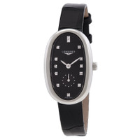 Silver-tone stainless steel case with a black leather strap. Fixed diamond set bezel. Black dial with silver-tone hands and diamond hour markers. Dial Type: Analog. One - small second subdial. Longines Calibre L176 quartz movement. Scratch resistant sapphire crystal. Solid case back. Case size: 21.90 mm x 34.00 mm. Oval case shape. Band width: 11 mm. Buckle clasp. Water resistant at 30 meters / 100 feet. Functions: hour, minute, small second. Dress watch style. Watch label: Swiss Made. Longines Symphonette Diamond Ladies Watch L2.306.4.57.0. GENERAL Box Type: Original Box CASE Case Diameter: 34 mm Case Material: Stainless Steel Case Shape: Oval Case Back: Solid BAND Band Material: Leather Band Type: Strap Band Color: Black Band Width: 11 mm Clasp: Buckle DIAL Dial Color: Black Type: Analog Crystal: Scratch Resistant Sapphire Hands: Silver-tone Dial Markers: Diamond Sub Dials: One - Small Second Bezel: Fixed Bezel Material: Diamond Set INFORMATION Brand: Longines Series: Symphonette Collection Name: Symphonette Gender: Womens Model: L2.306.4.57.0 Watch Label: Swiss Made Movement: Quartz Engine: Longines Calibre L176 FEATURES Water Resistance: 30 meters / 100 feet Functions: Hour, Minute, Small Second Watch Features: Analog, Leather, Stainless Steel, Diamond ADDITIONAL INFO Watch Style: Dress Warranty: 2 Year Jomashop Warranty Jomashop Sku: LNG23064570 Department: Watches Category: Watches