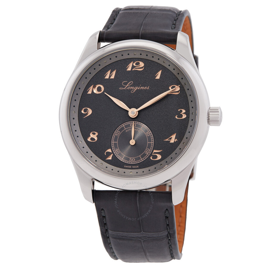 Silver-tone stainless steel case with a grey alligator band. Fixed silver-tone bezel. Grey dial with rose gold-tone hands and Arabic numeral hour markers. Minute markers around the outer rim. Dial Type: Analog. One subdial displaying: small second. Longines Calibre L893 Automatic movement, containing 27 Jewels, bitting at 25200 vph, and has a power reserve of approximately 72 hours. Scratch resistant sapphire crystal. Transparent see through case back. Round case shape, case size: 38 mm. Fold over clasp with a safety release. Water resistant at 30 meters / 100 feet. Functions: hour, minute, small second. Additional Info: original box, international warranty card, manual (complete accessories). The Longines Master Collection Series. Luxury watch style. Watch label: Swiss Made. Longines The Longines Master Collection Automatic Grey Dial Men's Watch L2.843.4.63.2. GENERAL Box Type: Original Box CASE Case Diameter: 38 mm Case Material: Stainless Steel Case Shape: Round Case Back: Transparent See Through BAND Band Material: Alligator Band Type: Strap Band Color: Grey Clasp: Fold Over with Safety Release DIAL Dial Color: Grey Type: Analog Crystal: Scratch Resistant Sapphire Hands: Rose Gold-tone Dial Markers: Arabic Numeral Second Markers: Minute Markers around the outer rim Sub Dials: One - Small Second Bezel: Fixed Bezel Color: Silver-tone INFORMATION Brand: Longines Series: The Longines Master Collection Collection Name: The Longines Master Collection Gender: Mens Model: L2.843.4.63.2 Watch Label: Swiss Made Movement: Automatic Engine: Longines Calibre L893 Power Reserve: 72 hours FEATURES Water Resistance: 30 meters / 100 feet Functions: Hour, Minute, Small Second Watch Features: Alligator Leather, Analog, Gold, Stainless Steel ADDITIONAL INFO Watch Style: Luxury Warranty: 2 Year Jomashop Warranty Additional Info: Original Box, Manual (Complete Accessories) Jomashop Sku: LNG28434632 Department: Watches