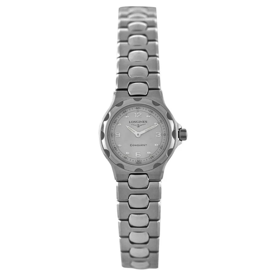 Silver-tone stainless steel case and bracelet. Silver-tone stainless steel bezel. Silver-tone dial with silver-tone hands and Arabic numeral & index hour markers. Minute markers around the outer rim. Dial Type: Analog. Luminescent hands. Quartz movement. Solid case back. Round case shape, case size: 22 mm. Fold over clasp with a safety release. Functions: hour, minute. Conquest Series. Casual watch style. Watch label: Swiss Made. Pre-owned Longines Conquest Quartz Silver Dial Ladies Watch L1.130.4.76.6. GENERAL Comments: This new store display model comes in its original Longines box. As a store display, this watch might have some extremely tiny scratches, and the box shows minor imperfections on the inside. It passed the water pressure test, and the quartz movement keeps perfect time. It fits wrists up to 7 inches. Authenticity is 100% guaranteed. Preowned Item Condition: Unworn / Like New CASE Case Material: Stainless Steel Case Shape: Round Case Back: Solid BAND Band Material: Stainless Steel Band Type: Bracelet Band Color: Silver-tone Clasp: Fold Over with Safety Release DIAL Dial Color: Silver-tone Type: Analog Hands: Silver-tone Dial Markers: Arabic Numeral & Index Second Markers: Minute Markers around the outer rim Luminiscence: Hands Bezel Color: Silver-tone Bezel Material: Stainless Steel INFORMATION Brand: Longines Series: Conquest Collection Name: Conquest Gender: Womens Model: L1.130.4.76.6 Watch Label: Swiss Made Movement: Quartz FEATURES Functions: Hour, Minute Watch Features: Analog, Stainless Steel ADDITIONAL INFO Watch Style: Casual Warranty: 1 Year Jomashop Warranty Jomashop Sku: PRE-P-LNG103443 Department: Watches Category: Watches