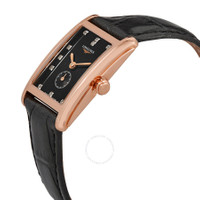 Rose gold-tone stainless steel case with a black (alligator) leather strap. Fixed rose gold-tone stainless steel bezel. Black dial with rose gold-tone hands and diamond hour markers. Dial Type: Analog. One subdial displaying: small seconds. Longines Calibre L178 quartz movement. Scratch resistant sapphire crystal. Pull / push crown. Solid case back. Rectangle case shape, case size: 20.5 mm x 32 mm. Tang clasp. Water resistant at 30 meters / 100 feet. Functions: hour, minute, small second. Dolcevita Series. Dress watch style. Watch label: Swiss Made. Pre-owned Longines Dolcevita Quartz Diamond Black Dial Ladies Watch L5.255.8.57.0. GENERAL Collection Name: Dolcevita INFORMATION Brand: Longines Series: Dolcevita Model: L5.255.8.57.0 Gender: Womens Watch Label: Swiss Made Movement: Quartz Engine: Longines Calibre L178 CONDITION INFORMATION Box: Yes Preowned Item Condition: Excellent Papers: No Comments: Includes manual. CASE Case Size: 20.5 mm x 32 mm Case Material: Stainless Steel Case Shape: Rectangle Case Back: Solid DIAL Type: Analog Dial Color: Black Crystal: Scratch Resistant Sapphire Hands: Rose Gold-tone Dial Markers: Diamond Sub Dials: Small Seconds Bezel: Fixed Bezel Color: Rose Gold-tone Bezel Material: Stainless Steel Crown: Pull / Push BAND Band Type: Strap Band Material: (Alligator) Leather Band Color: Black Clasp: Tang FEATURES Water Resistance: 30 meters / 100 feet Functions: Hour, Minute, Small Second Watch Features: Alligator Leather, Analog, Gold, Leather, Stainless Steel, Diamond ADDITIONAL INFO Watch Style: Dress Warranty: 1 Year Jomashop Warranty Jomashop Sku: PRE-Z-LNG52558570 Department: Watches Category: Watches