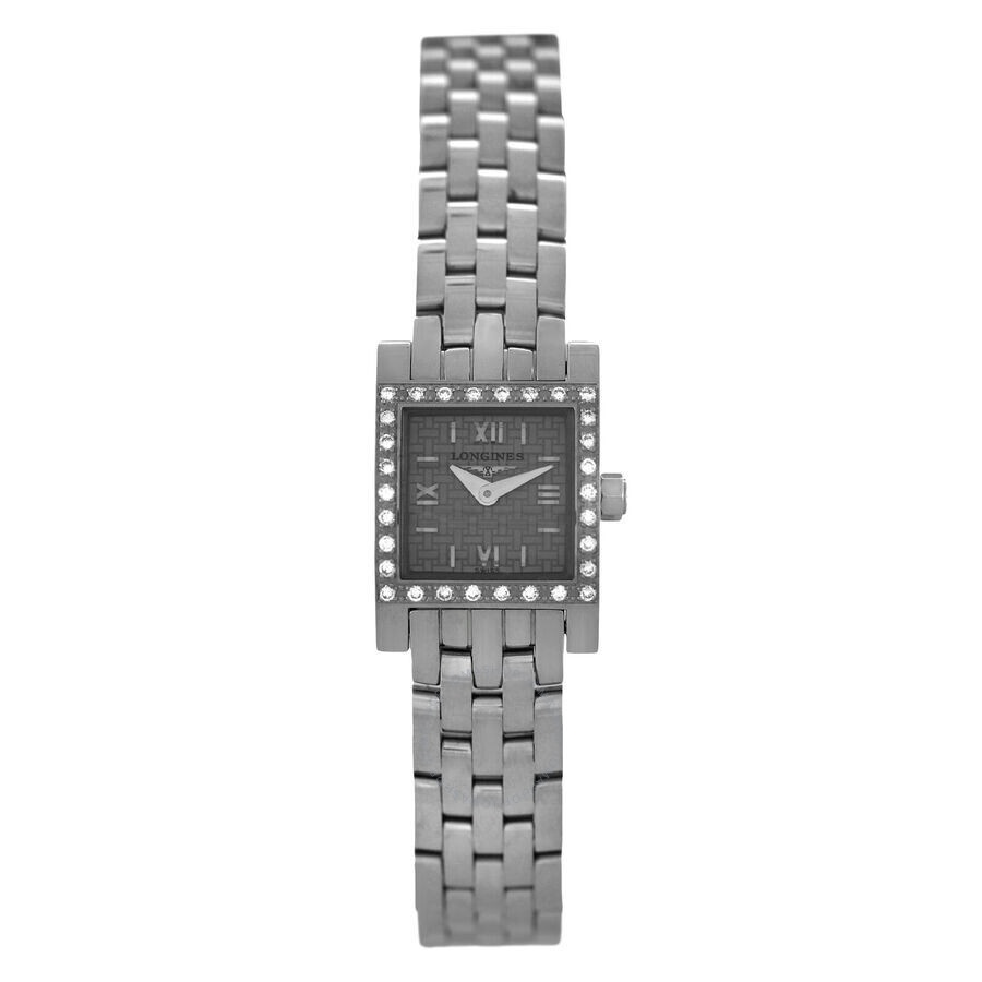 Silver-tone stainless steel case and bracelet. Fixed silver-tone stainless steel bezel. Grey dial with silver-tone hands and Roman numeral hour markers. Dial Type: Analog. Quartz movement. Solid case back. Square case shape, case size: 16 mm. Fold over clasp with a safety release. Functions: hour, minute. Dolchevita Series. Casual watch style. Watch label: Swiss Made. Pre-owned Longines Dolchevita Quartz Grey Dial Ladies Watch L5.161.0.65.6. GENERAL Collection Name: Dolchevita INFORMATION Brand: Longines Series: Dolchevita Model: L5.161.0.65.6 Gender: Womens Watch Label: Swiss Made Movement: Quartz CONDITION INFORMATION Box: No Preowned Item Condition: Unworn / Like New Papers: Yes Comments: This new store display model watch has a blank warranty card and a manual, as shown in the photos. Due to being a store display, this watch might have some extremely tiny scratches. It passed the water pressure test, and the quartz movement keeps perfect time. It fits wrists up to 6.5 inches. Authenticity is 100% guaranteed. CASE Case Diameter: 16 Case Material: Stainless Steel Case Shape: Square Case Back: Solid DIAL Type: Analog Dial Color: Grey Hands: Silver-tone Dial Markers: Roman Numeral Bezel: Fixed Bezel Color: Silver-tone Bezel Material: Stainless Steel BAND Band Type: Bracelet Band Material: Stainless Steel Band Color: Silver-tone Clasp: Fold Over with Safety Release FEATURES Functions: Hour, Minute Watch Features: Stainless Steel, Analog ADDITIONAL INFO Watch Style: Casual Warranty: 1 Year Jomashop Warranty Jomashop Sku: PRE-P-LNG98289 Department: Watches