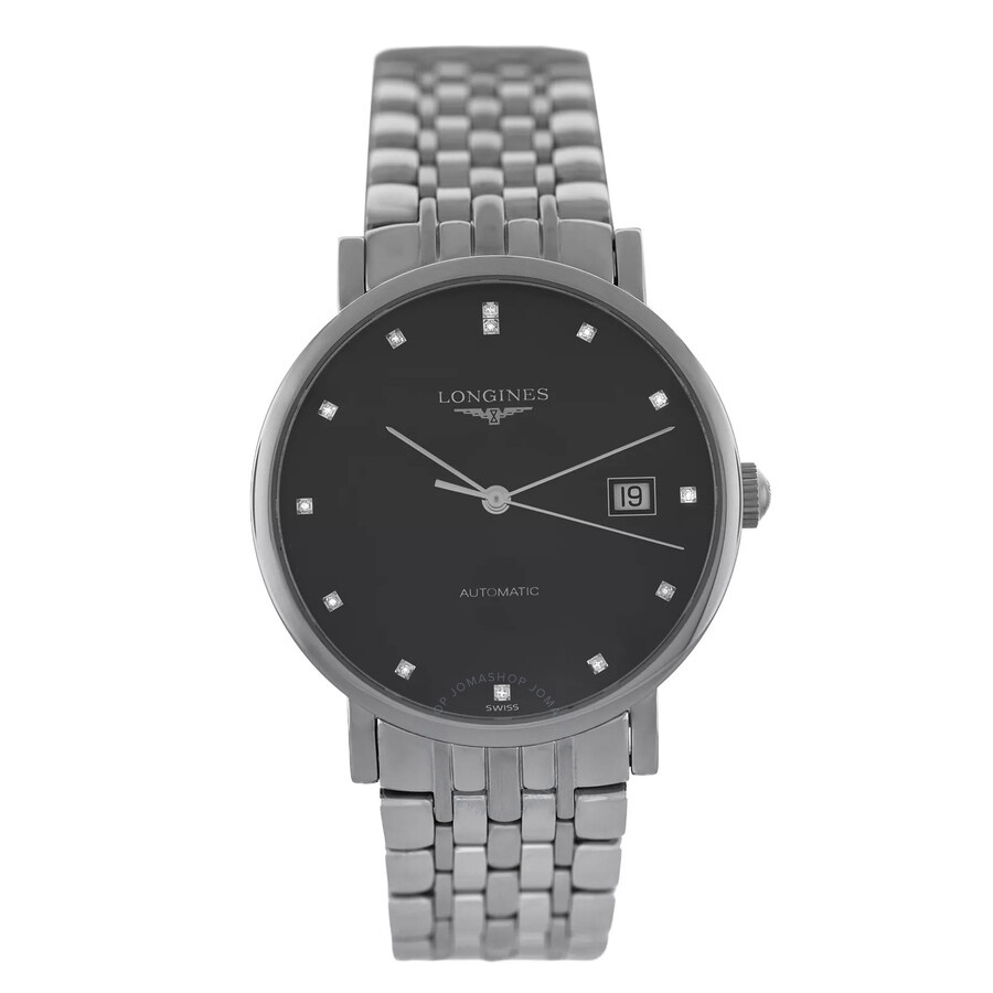 Silver-tone stainless steel case and bracelet. Fixed silver-tone stainless steel bezel. Black dial with silver-tone hands and diamond hour markers. Dial Type: Analog. Date display at the 3 o'clock position. Longines Calibre L619 Automatic movement, based upon ETA 2892-A2, containing 21 Jewels, bitting at 28800 vph, and has a power reserve of approximately 42 hours. Scratch resistant sapphire crystal. Pull / push crown. Transparent see through case back. Round case shape, case size: 37 mm. Fold over clasp with a safety release. Water resistant at 30 meters / 100 feet. Functions: date, hour, minute, second. Elegant Collection Series. Luxury watch style. Watch label: Swiss Made. Item Variations: L4.810.4,. Pre-owned Longines Elegant Collection Automatic Diamond Black Dial Men's Watch L4.810.4.57.6. GENERAL Collection Name: Elegant Collection INFORMATION Brand: Longines Series: Elegant Collection Model: L4.810.4.57.6 Gender: Mens Watch Label: Swiss Made Movement: Automatic Engine: Longines Calibre L619 Power Reserve: 42 hours CONDITION INFORMATION Box: No Preowned Item Condition: Unworn / Like New Papers: Yes CASE Case Size: 37 Case Material: Stainless Steel Case Shape: Round Case Back: Transparent See Through DIAL Type: Analog Dial Color: Black Crystal: Scratch Resistant Sapphire Hands: Silver-tone Dial Markers: Diamond Bezel: Fixed Bezel Color: Silver-tone Bezel Material: Stainless Steel Crown: Pull / Push BAND Band Type: Bracelet Band Material: Stainless Steel Band Color: Silver-tone Clasp: Fold Over with Safety Release FEATURES Water Resistance: 30 meters / 100 feet Calendar: Date display at the 3 o'clock position Functions: Date, Hour, Minute, Second Watch Features: Analog, Stainless Steel, Diamond ADDITIONAL INFO Watch Style: Luxury Warranty: 1 Year Jomashop Warranty Jomashop Sku: PRE-P-LNG94236 Item Variation: L4.810.4, Department: Watches