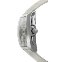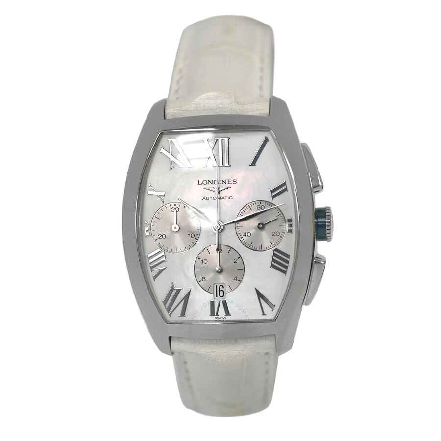 Silver-tone stainless steel case with a white crocodile leather strap. Fixed silver-tone stainless steel bezel. Mother of pearl dial with silver-tone hands and Roman numeral hour markers. Dial Type: Analog. Date display at the 6 o'clock position. Chronograph - three sub-dials displaying: 60 second, 30 minute and 12 hour. Automatic movement. Tonneau case shape, case size: 35 mm. Fold over clasp with a safety release. Functions: chronograph, date, hour, minute, second. Evidenza Series. Luxury watch style. Watch label: Swiss Made. Pre-owned Longines Evidenza Chronograph Automatic Men's Watch L2.643.4.89.0. GENERAL Collection Name: Evidenza INFORMATION Brand: Longines Series: Evidenza Model: L2.643.4.89.0 Gender: Mens Watch Label: Swiss Made Movement: Automatic CONDITION INFORMATION Box: No Preowned Item Condition: Mint Papers: Yes Comments: This watch is in near-mint condition with no visible scratches to the naked eye, but it may have some tiny scratches, which are visible under very close-up inspection. The watch comes with a filled-out warranty card two instruction booklets. The leather strap shows some signs of wear, please view detailed pictures. It has passed the water pressure test, and we will include the printout of the test results. Automatic movement is in good working order and keeps time within standards. Fits the wris CASE Case Material: Stainless Steel Case Shape: Tonneau DIAL Type: Analog Dial Color: Mother of Pearl Hands: Silver-tone Dial Markers: Roman Numeral Sub Dials: Three - 60 Second, 30 Minute and 12 Hour Bezel: Fixed Bezel Color: Silver-tone Bezel Material: Stainless Steel BAND Band Type: Strap Band Material: Crocodile Leather Band Color: White Clasp: Fold Over with Safety Release FEATURES Calendar: Date display at the 6 o'clock position Functions: Chronograph, Date, Hour, Minute, Second Watch Features: Analog, Leather, Stainless Steel, Chronograph ADDITIONAL INFO Watch Style: Luxury Warranty: 1 Year Jomashop Warranty Jomashop Sku: PRE-P-LNG99342 Department: Watches