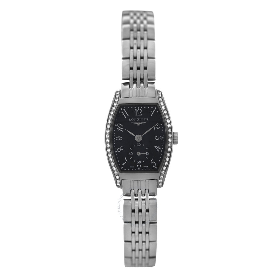 Silver-tone stainless steel case and bracelet. Fixed bezel with diamond set stainless steel. Black dial with silver-tone hands and Arabic numeral hour markers. Minute markers around the outer rim. Dial Type: Analog. One subdial displaying: small second. Longines Calibre L178 quartz movement. Scratch resistant sapphire crystal. Solid case back. Tonneau case shape, case size: 20 mm. Fold over clasp with a safety release. Water resistant at 30 meters / 100 feet. Functions: hour, minute, small second. Evidenza Series. Luxury watch style. Watch label: Swiss Made. Pre-owned Longines Evidenza Quartz Diamond Black Dial Ladies Watch L2.175.0.53.6. GENERAL Collection Name: Evidenza INFORMATION Brand: Longines Series: Evidenza Model: L2.175.0.53.6 Gender: Womens Watch Label: Swiss Made Movement: Quartz Engine: Longines Calibre L178 CONDITION INFORMATION Box: No Preowned Item Condition: Unworn / Like New Papers: Yes Comments: This new store display model watch has a blank warranty card and a manual, as shown in the photos. The diamond specs are shown in the 3rd photo of the diamond certificate. Due to being a store display, this watch might have some extremely tiny scratches. It passed the water pressure test, and the quartz movement keeps perfect time. It fits wrists up to 7 inches. Authenticity is 100% guaranteed. CASE Case Material: Stainless Steel Case Shape: Tonneau Case Back: Solid DIAL Type: Analog Dial Color: Black Crystal: Scratch Resistant Sapphire Hands: Silver-tone Second Markers: Minute Markers around the outer rim Dial Markers: Arabic Numeral Sub Dials: One - Small Second Bezel: Fixed Bezel Material: Diamond Set Stainless Steel BAND Band Type: Bracelet Band Material: Stainless Steel Band Color: Silver-tone Clasp: Fold Over with Safety Release FEATURES Water Resistance: 30 meters / 100 feet Functions: Hour, Minute, Small Second Watch Features: Analog, Stainless Steel, Diamond ADDITIONAL INFO Watch Style: Luxury Warranty: 1 Year Jomashop Warranty Jomashop Sku: PRE-P-LNG99132 Department: Watches