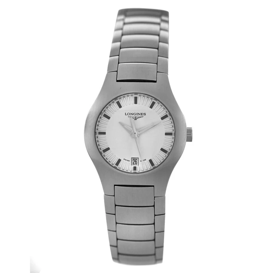 Silver-tone stainless steel case and bracelet. Fixed silver-tone stainless steel bezel. Silver-tone dial with silver-tone hands and index hour markers. Minute markers around the outer rim. Dial Type: Analog. Date display at the 6 o'clock position. Quartz movement. Solid case back. Round case shape, case size: 25 mm. Fold over clasp with a safety release. Functions: date, hour, minute, second. Oposition Round Series. Casual watch style. Watch label: Swiss Made. Pre-owned Longines Oposition Round Quartz Silver Dial Ladies Watch L3.117.4.72.6. GENERAL Comments: This new store display model watch comes in its original box with a blank warranty card and a manual, as shown in the photos. As a store display, this watch may have some extremely minor scratches. The box shows imperfections on the inside due to storage, as shown in the photo. It passed the water pressure test, and the quartz movement keeps perfect time. It fits wrists up to 6 inches. Authenticity is 100% guaranteed. Preowned Item Condition: Unworn / Like New CASE Case Material: Stainless Steel Case Shape: Round Case Back: Solid BAND Band Material: Stainless Steel Band Type: Bracelet Band Color: Silver-tone Clasp: Fold Over with Safety Release DIAL Dial Color: Silver-tone Type: Analog Hands: Silver-tone Dial Markers: Index Second Markers: Minute Markers around the outer rim Bezel: Fixed Bezel Color: Silver-tone Bezel Material: Stainless Steel INFORMATION Brand: Longines Series: Oposition Round Collection Name: Oposition Round Gender: Womens Model: L3.117.4.72.6 Watch Label: Swiss Made Movement: Quartz FEATURES Calendar: Date display at the 6 o'clock position Functions: Date, Hour, Minute, Second Watch Features: Analog, Stainless Steel ADDITIONAL INFO Watch Style: Casual Warranty: 1 Year Jomashop Warranty Jomashop Sku: PRE-P-LNG102759 Department: Watches Category: Watches