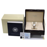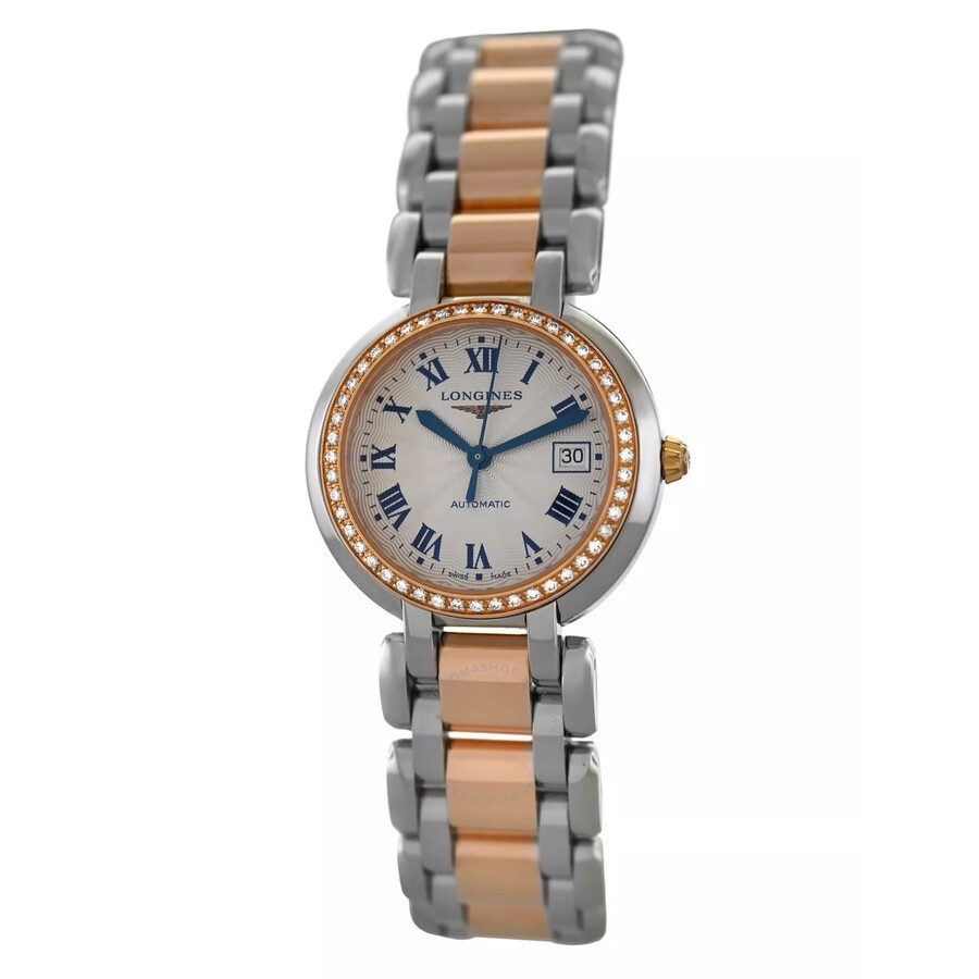 Silver-tone stainless steel case with a two-tone (silver-tone and rose gold-tone) 18kt rose gold and stainless steel bracelet. Fixed rose gold-tone bezel with diamond set 18kt rose gold. White dial with blue hands and Roman numeral hour markers. Minute markers around the outer rim. Dial Type: Analog. Date display at the 3 o'clock position. Automatic movement. Solid case back. Round case shape, case size: 30 mm. Band length: 6.75 inches. Fold over clasp with a safety release. Water resistant at 30 meters / 100 feet. Functions: date, hour, minute, second. Primaluna Series. Luxury watch style. Watch label: Swiss Made. Item Variations: L8.113.5. Pre-owned Longines Primaluna Automatic Diamond White Dial Ladies Watch L8.113.5.79.6. GENERAL Collection Name: Primaluna INFORMATION Brand: Longines Series: Primaluna Model: L8.113.5.79.6 Gender: Womens Watch Label: Swiss Made Movement: Automatic CONDITION INFORMATION Box: Yes Preowned Item Condition: Unworn / Like New Papers: Yes Comments: The new store display model watch comes in a box with a filled-out guarantee card dated 14.11.2023. This watch may have some tiny scratches due to being a store display. It fits the woman's wrist up to 6.75 inches. Authenticity is 100% guaranteed. CASE Case Size: 30 Case Material: Stainless Steel Case Shape: Round Case Back: Solid DIAL Type: Analog Dial Color: White Hands: Blue Second Markers: Minute Markers around the outer rim Dial Markers: Roman Numeral Bezel: Fixed Bezel Color: Rose Gold-tone Bezel Material: Diamond Set 18kt Rose Gold BAND Band Type: Bracelet Band Material: 18kt Rose Gold and Stainless Steel Band Color: Two-tone (Silver-tone and Rose Gold-tone) Band Length: 6.75 inches Clasp: Fold Over with Safety Release FEATURES Water Resistance: 30 meters / 100 feet Calendar: Date display at the 3 o'clock position Functions: Date, Hour, Minute, Second Watch Features: Analog, Gold, Stainless Steel, Diamond ADDITIONAL INFO Watch Style: Luxury Warranty: 1 Year Jomashop Warranty Jomashop Sku: PRE-P-LNG85083 Item Variation: L8.113.5 Department: Watches