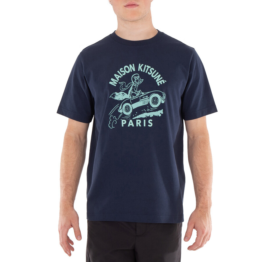 Maison Kitsune Men's Tops. Fashion category: T-Shirts & Henleys. SKU: MM00109KJ0118-INK BL. Color: Blue. Maison Kitsune Racing Fox Cotton Comfort T-Shirt. A cotton t-shirt features a playful graphic of a fox driving a vintage car, paired with the brand's logo and "Paris" text in soft mint tones. Crafted from high-quality cotton, this tee features a crew neckline, short sleeves, a straight hem and regular fit. 100% Cotton. GENERAL Color: Blue INFORMATION Brand: Maison Kitsune Gender: Mens Model: MM00109KJ0118-INK BL DETAILS Category: Tops Apparel Type: T-Shirts & Henleys Material: Cotton ADDITIONAL INFO Jomashop Sku: -MM00109KJ0118INKBL Department: Clothing