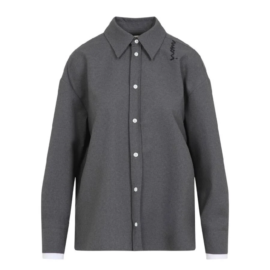 Marni Ladies Tops. Fashion category: Shirts & Blouses. SKU: CAMA0613QS-GRAPHITE. Color: Graphite. Marni Long Sleeve Shirt. This shirt showcases a pointed collar and a subtle contrasting black logo on the right shoulder. It features long sleeves with buttoned cuffs and a straight hem for a clean, polished finish. 100% Virgin Wool. GENERAL Color: Graphite INFORMATION Brand: Marni Gender: Womens Model: CAMA0613QS-GRAPHITE DETAILS Category: Tops Apparel Type: Shirts & Blouses Material: Wool ADDITIONAL INFO Jomashop Sku: -CAMA0613QSGRAPHITE Department: Clothing