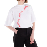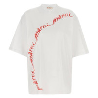 Marni Ladies Tops. Fashion category: T-Shirts & Henleys. SKU: THJE0263P7-LILY WHITE. Color: White. Marni Wavy Logo Cotton-Jersey T-Shirt. This shirt features a mock neck, drop shoulders, oversized short sleeves, and a painterly repeating logo in red across the front. 100% Cotton. GENERAL Color: White INFORMATION Brand: Marni Gender: Womens Model: THJE0263P7-LILY WHITE DETAILS Category: Tops Apparel Type: T-Shirts & Henleys Material: Cotto ADDITIONAL INFO Jomashop Sku: -THJE0263P7LILYWHITE Department: Clothing