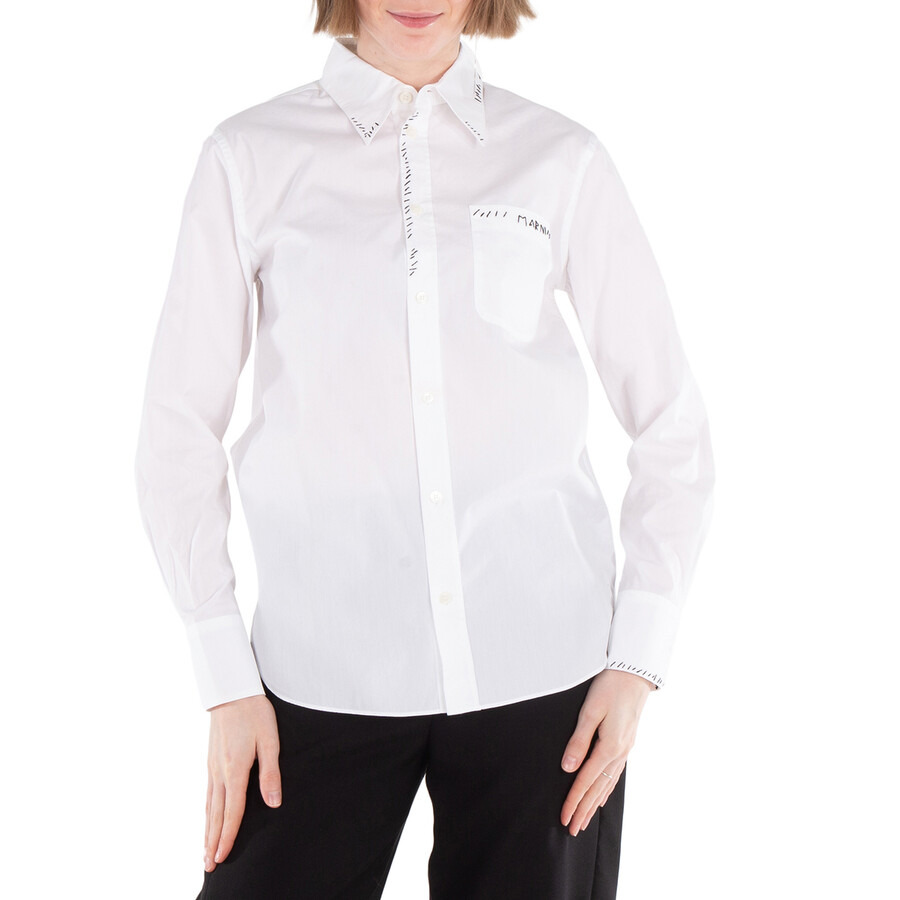 Marni Ladies Tops. Fashion category: Casual Button-Downs. SKU: CAMA0103S5-LILY WHITE. Color: White. Marni White Cotton Poplin Shirt. A cotton poplin shirt featuring stitched details, a classic collar, a rounded hem, and a button fastening, embellished with Marni lettering stitched on the breast pocket. 100% cotton. Made in Turkey. GENERAL Color: White INFORMATION Brand: Marni Gender: Womens Model: CAMA0103S5-LILY WHITE DETAILS Category: Tops Apparel Type: Casual Button-Downs Material: Cotton ADDITIONAL INFO Jomashop Sku: -CAMA0103S5LILYWHITE Department: Clothing