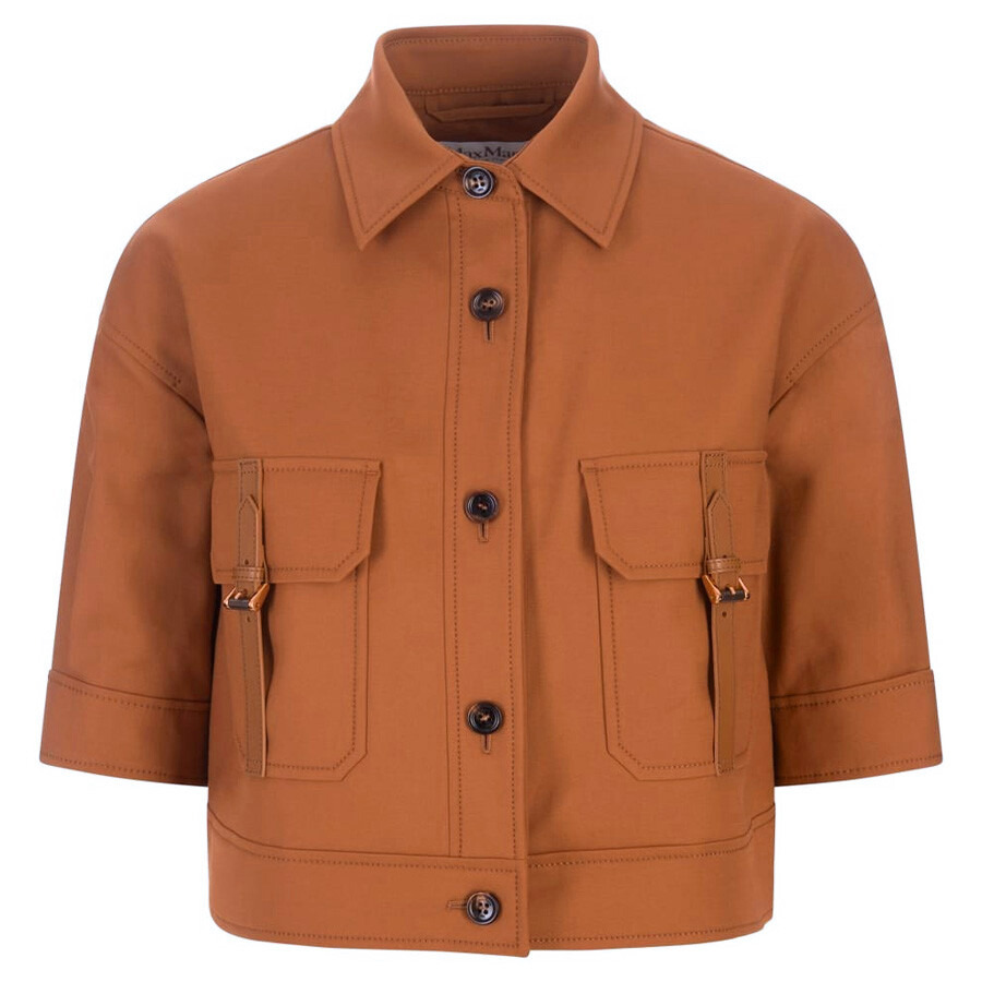 Max Mara Ladies Outerwear. Fashion category: Coats & Jackets. SKU: AGIATE003. Color: Tobacco. Max Mara Agiate Cropped Stretch-Cotton Jacket. Crafted from stretch cotton, the Agiate jacket features a spread collar, button fastenings through the front, buckled flap pockets, three-quarter sleeves, buttoned cuffs, and a cropped design for a stylish and versatile look. 95% cotton, 5% elastane. GENERAL Color: Tobacco INFORMATION Brand: Max Mara Gender: Womens Model: AGIATE003 DETAILS Category: Outerwear Apparel Type: Coats & Jackets Material: Cotton, Elastane ADDITIONAL INFO Jomashop Sku: -AGIATE003 Department: Clothing