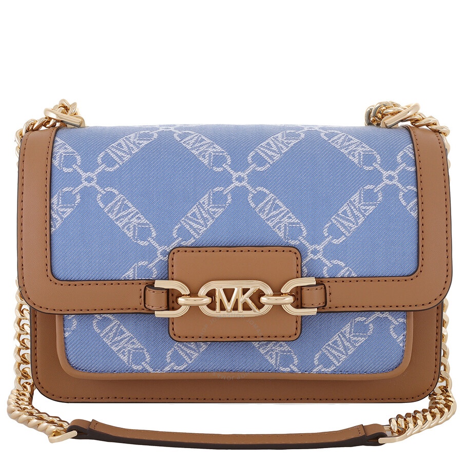 Michael Kors Ladies Shoulder Bag. SKU: 30R4G7HL3U465. Color: Blue. Size: 23 x 15 x 8 cm. Michael Kors Heather Empire Logo Shoulder Bag. The Heather shoulder bag features a coated canvas construction with a monogram pattern, accented by a gold-tone logo plaque and leather trim. Designed with a foldover top and magnetic fastening, it includes a sliding chain-link shoulder strap, a rear slit pocket, a partitioned compartment, an internal slip pocket, and a debossed internal logo. Finished with gold-tone hardware and a logo-jacquard lining. Outer: Calf Leather 100%, Fabric 100%. GENERAL Size Info: 23 x 15 x 8 cm Brand Type: Designer Color: Blue INFORMATION Brand: Michael Kors Gender: Womens Model: 30R4G7HL3U465 DETAILS Material: Fabric, Leather Closure: Magnetic Snap ADDITIONAL INFO UPC Code: 196237507396 Jomashop Sku: Z-G7HPX Department: Bags Category: Shoulder Bag