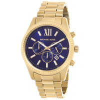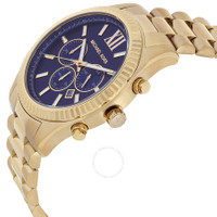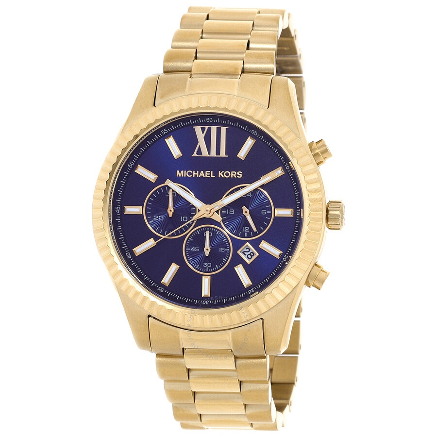 Gold-tone stainless steel case and bracelet. Fixed gold-tone stainless steel bezel. Blue dial with gold-tone hands and index-Roman numeral hour markers. Minute markers around the outer rim. Dial Type: Analog. Date display between 4 and 5 o'clock position. Chronograph - three sub-dials displaying: 60 second, 30 minute and 24 hour. Quartz movement. Scratch resistant mineral crystal. Pull / push crown. Solid case back. Round case shape, case size: 44 mm. Band width: 22 mm. Fold over clasp with a safety release. Water resistant at 100 meters / 330 feet. Functions: chronograph, date, hour, minute, second. Lexington Series. Sport watch style. Michael Kors Lexington Chronograph Quartz Blue Dial Men's Watch MK9153. GENERAL Box Type: Original Box Brand Type: Designer CASE Case Material: Stainless Steel Case Shape: Round Case Back: Solid BAND Band Material: Stainless Steel Band Type: Bracelet Band Color: Gold-tone Band Width: 22 mm Clasp: Fold Over with Safety Release DIAL Dial Color: Blue Type: Analog Crystal: Scratch Resistant Mineral Hands: Gold-tone Dial Markers: Index-Roman Numeral Second Markers: Minute Markers around the outer rim Sub Dials: Three - 60 Second, 30 Minute and 24 Hour Bezel: Fixed Bezel Color: Gold-tone Bezel Material: Stainless Steel Crown: Pull / Push INFORMATION Brand: Michael Kors Series: Lexington Collection Name: Lexington Gender: Mens Model: MK9153 Movement: Quartz FEATURES Water Resistance: 100 meters / 330 feet Calendar: Date display between 4 and 5 o'clock position Functions: Chronograph, Date, Hour, Minute, Second Watch Features: Analog, Gold, Stainless Steel, Chronograph ADDITIONAL INFO Watch Style: Sport Warranty: 2 Year Jomashop Warranty UPC Code: 4064092271218 Jomashop Sku: MK9153 Department: Watches