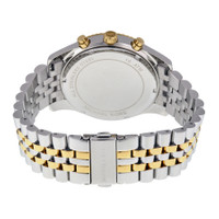 Stainless steel case with a two-tone (silver and yellow gold-tone) stainless steel bracelet. Fixed yellow gold-tone bezel. White dial with luminous yellow gold-tone hands and index hour markers. Roman numeral marks the 12 o'clock position. Minute markers around the outer rim. Dial Type: Analog. Luminescent hands and markers. Date display between the 4 and 5 o'clock positions. Chronograph - three sub-dials displaying: 60 second, 30 minute and 24 hour. Quartz movement. Scratch resistant mineral crystal. Pull / push crown. Solid case back. Round case shape. Case size: 45 mm. Case thickness: 13 mm. Band width: 22 mm. Band length: 9 inches. Fold over clasp with a push button release. Water resistant at 100 meters / 330 feet. Functions: chronograph, date, hour, minute, second. Casual watch style. Michael Kors Lexington Chronograph White Dial Men's Watch MK8344. GENERAL Box Type: Original Box Brand Type: Designer CASE Case Diameter: 45 mm Case Thickness: 13 mm Case Material: Stainless Steel Case Shape: Round Case Back: Solid BAND Band Material: Stainless Steel Band Type: Bracelet Band Color: Two-tone (Silver-tone and Yellow Gold-tone) Band Length: 9 inches Band Width: 22 mm Clasp: Fold Over with Push Button Release DIAL Dial Color: White Type: Analog Crystal: Scratch Resistant Mineral Hands: Luminous Yellow Gold-tone Dial Markers: Index Second Markers: Roman Numeral marks the 12 o'clock position. Minute Markers around the outer rim Sub Dials: Three - 60 Second, 30 Minute and 24 Hour Luminiscence: Hands and Markers Bezel: Fixed Bezel Color: Yellow Gold-tone Bezel Material: Stainless Steel Crown: Pull / Push INFORMATION Brand: Michael Kors Series: Lexington Collection Name: Lexington Gender: Mens Model: MK8344 Movement: Quartz FEATURES Water Resistance: 100 meters / 330 feet Calendar: Date display between the 4 and 5 o'clock positions Functions: Chronograph, Date, Hour, Minute, Second Watch Features: Analog, Gold, Stainless Steel, Chronograph ADDITIONAL INFO Watch Style: Casual Warranty: 2 Year Jomashop Warranty UPC Code: 796483077591 Jomashop Sku: MK8344 Department: Watches Category: Watches