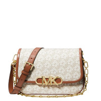 Michael Kors Ladies Messenger. SKU: 30H3G7PM6B099. Color: Beige. Size: W:9.75" x H:7" x D:3.75". Michael Kors Medium Empire Signature Logo Messenger Bag. This messenger bag features logo-print canvas with leather trim, chain-link accents, a logo-lined interior, a back slip pocket, and interior back zip and front slip pockets, all secured with a snap fastening. 80% coated canvas/16% polyester/4% cotton. GENERAL Size Info: W:9.75" x H:7" x D:3.75" Color: Beige INFORMATION Brand: Michael Kors Gender: Womens Model: 30H3G7PM6B099 DETAILS Material: Canvas, Cotton, Polyester Closure: Snap DIMENSIONS Size: Medium ADDITIONAL INFO UPC Code: 196237354020 Jomashop Sku: Z-RS4NT Department: Bags Category: Messenger