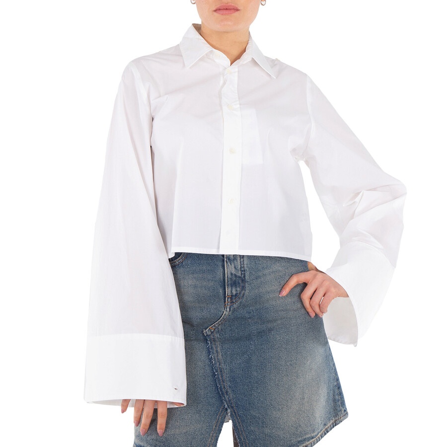 Brand: MM6. Fashion category: Shirts & Blouses. SKU: S52DT0033-100-WHITE. Color: White. MM6 Cropped Long Sleeve Cotton Shirt. This shirt is made of cotton and features a poplin texture, a classic collar, front button fastening, long sleeves with buttoned cuffs, a straight hem, and a cropped design. 100% Cotton. GENERAL Color: White INFORMATION Brand: Mm6 Gender: Womens Model: S52DT0033-100-WHITE DETAILS Category: Tops Apparel Type: Shirts & Blouses Material: Cotton ADDITIONAL INFO Jomashop Sku: -S52DT0033100WHITE Department: Clothing