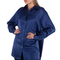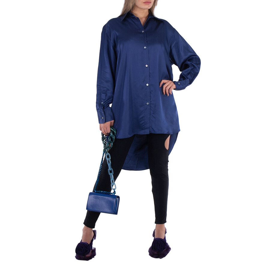 MM6 Maison Margiela Ladies Tops. Fashion category: Shirts & Blouses. SKU: S52DT0020. Color: Blue. MM6 Maison Margiela oversized satin cut-out shirt. Featuring intricate cut-out details and a front button closure. The silhouette is straight and asymmetrical with the front shorter than the back. It fastens with buttons on the front tab. The back is opened at the bottom. Viscose satin shirt. Made in Italy. GENERAL Color: Blue INFORMATION Brand: Mm6 Maison Margiela Gender: Womens Model: S52DT0020 DETAILS Category: Tops Apparel Type: Shirts & Blouses ADDITIONAL INFO Jomashop Sku: -S52DT0020BLUE Department: Apparel