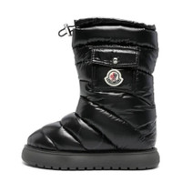 Moncler Ladies Boots. SKU: I209B4H00070-M2707-999. Color: Black. Moncler Gaia Pocket Round Toe Boots. This boots feature a round toe, padded design, a logo patch on the side, a side flap pocket, drawstring fastening and a slip-on style. Lining: Fabric 100%, Calf Leather 100%, Sole: Rubber 100%,Outer: Fabric 100%. Made in Italy. Please visit the brand website for sizing information. INFORMATION Brand: Moncler Model: I209B4H00070-M2707-999 Gender: Womens DETAILS Category: Boots Color: Black Upper Material: Fabric Lining Material: Fabric Sole Material: Rubber ADDITIONAL INFO Jomashop Sku: -209B4H00070M2707999 Department: Shoes