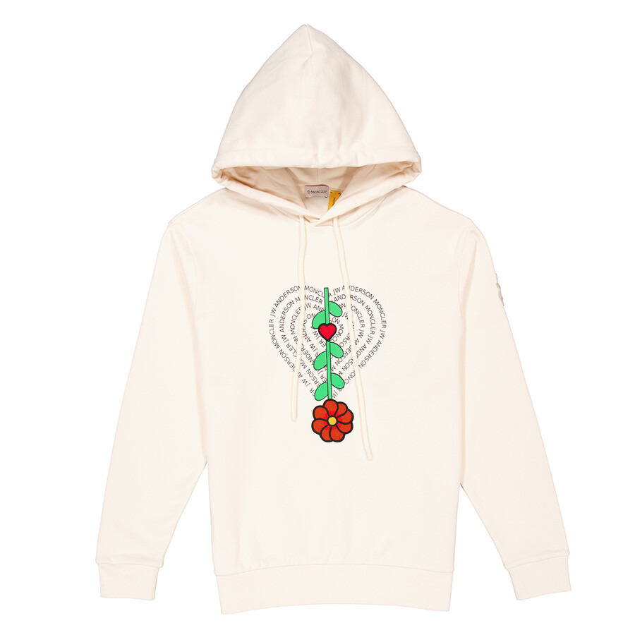 Moncler Men's Tops. Fashion category: Hoodies & Sweatshirts. SKU: I109E8G00003-040. Color: Beige. Moncler JW Anderson Embroidered Hoodie. This cotton hoodie features a crocheted flower design, a heart-shaped logo, and dual designer plaques on the sleeve for added style. It has a drawstring hood, long sleeves with ribbed detailing, and a relaxed fit for a comfortable and casual look. 100% cotton. GENERAL Brand Type: Designer Color: Beige INFORMATION Brand: Moncler Gender: Mens Model: I109E8G00003-040 DETAILS Category: Tops Apparel Type: Hoodies & Sweatshirts Material: Cotton ADDITIONAL INFO Jomashop Sku: -I109E8G00003040 Department: Clothing