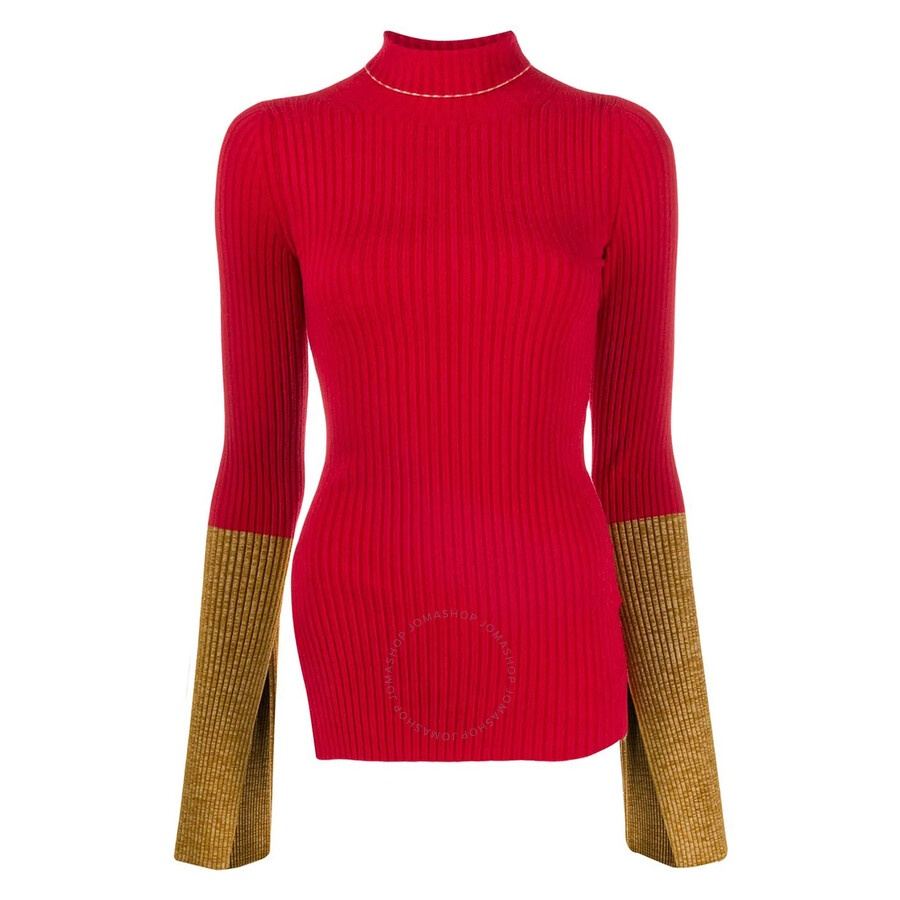 Moncler Ladies Tops. Fashion category: Cardigans & Sweaters. SKU: E20939253900-A9073-494. Color: Red. Moncler Ladies 1952 Turtleneck Contrast Cuff Sweater. This sweater from Moncler features long sleeves, contrasting cuffs with elbow-length slits, a V-cut hem, a turtleneck, and a slim-fit. Materials: 48% Polyamide, 52% Viscose. GENERAL Color: Red INFORMATION Brand: Moncler Gender: Womens Model: E20939253900-A9073-494 DETAILS Category: Tops Apparel Type: Cardigans & Sweaters Material: Polyamide, Viscose ADDITIONAL INFO Jomashop Sku: -20939253900A9073494 Department: Apparel