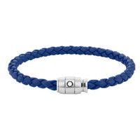 MontBlanc Bracelets. Color: Blue. Montblanc Blue Woven Leather Bracelet. This bracelet is woven from blue leather and features a polished stainless steel clasp, complemented by a single steel ring adorned with the iconic Montblanc emblem. Material: Leather, Steel. GENERAL Color: Blue INFORMATION Brand: Montblanc Gender: Mens Model: MB130900 DETAILS Ring Style: Fashion ADDITIONAL INFO Jomashop Sku: -130900N Department: Jewelry Category: Bracelets
