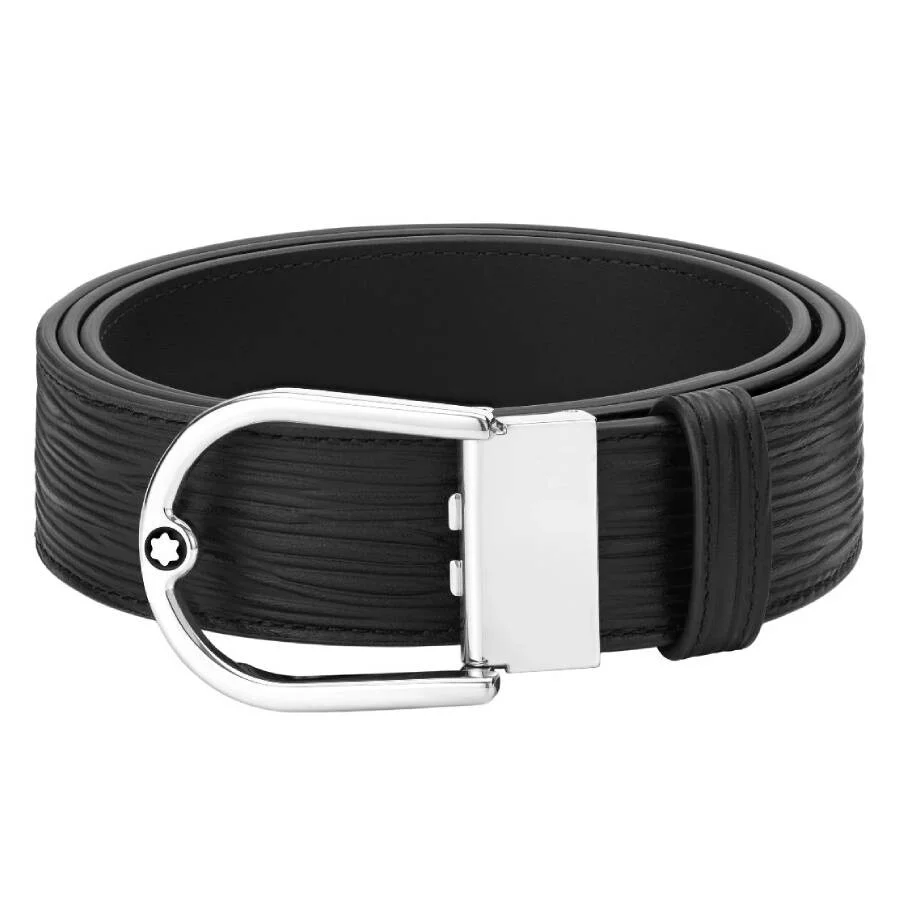 MontBlanc Men's Belts. SKU: 198634. Color: Black. Size: 47.2" x 0.2" x 1.4. Montblanc Horseshoe Buckle Printed 35 mm Reversible Leather Belt. This reversible 35mm belt features the 4810 tree-bark motif on one side and smooth black leather on the other, offering versatile style options. Finished with a timeless palladium-finish horseshoe buckle adorned with the Montblanc emblem. Material: Leather. GENERAL Ring Style: Fashion Size Info: 47.2" x 0.2" x 1.4 Material: Leather Gender: Mens Color: Black Apparel Type: Belts INFORMATION Brand: Montblanc Model: 198634 ADDITIONAL INFO UPC Code: 4062037805276 Jomashop Sku: MB198634 Department: Fashion Accessories Category: Belts