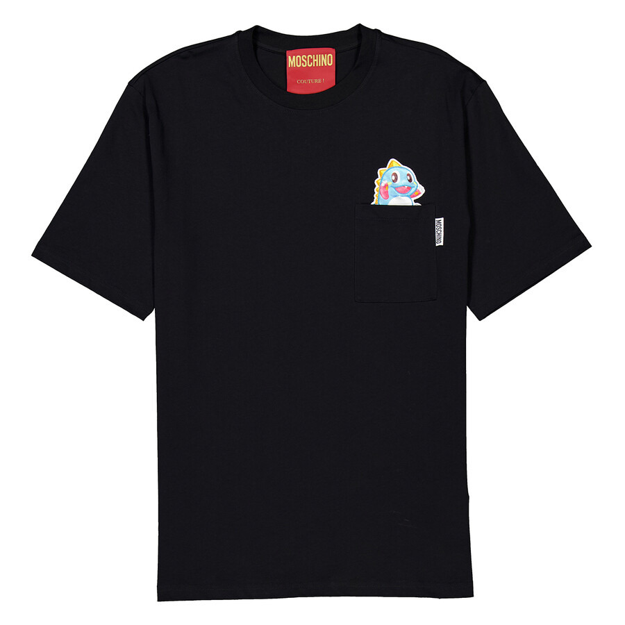 Moschino Men's Tops. Fashion category: T-Shirts & Henleys. SKU: 241D1B0796-BLACK. Color: Black. Moschino Bobble Dragon Embroidered Cotton T-Shirt. This organic cotton jersey T-shirt features a Bubble Bobble dragon patch embroidered on the front, part of the brands collaboration with Taito, with a regular fit, short sleeves, chest patch pocket, straight hem, and crew neckline. 100% Cotton. GENERAL Brand Type: Designer Color: Black INFORMATION Brand: Moschino Gender: Mens Model: 241D1B0796-BLACK DETAILS Category: Tops Apparel Type: T-Shirts & Henleys Material: Cotton ADDITIONAL INFO Jomashop Sku: -241D1B0796BLACK Department: Clothing