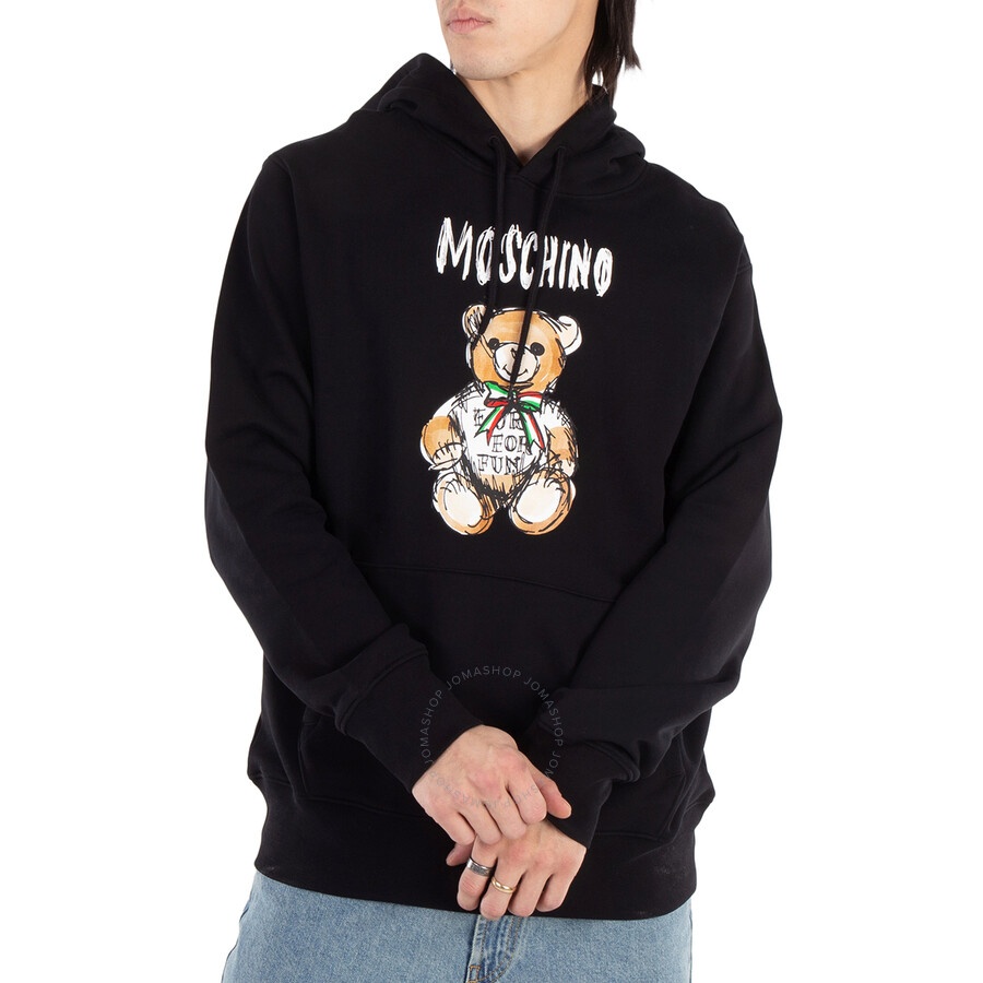 Moschino Men's Tops. Fashion category: Hoodies & Sweatshirts. SKU: 241ZZV1716-FANTASY PRINT BLACK. Color: Black. oschino Drawn Teddy Bear Logo Hoodie. This slim-fit hoodie features a drawstring hood, dropped shoulders, a signature Teddy Bear print, a front logo print, long sleeves, and a front pouch pocket. 100% Cotton. Made in Portugal. GENERAL Brand Type: Designer Color: Black INFORMATION Brand: Moschino Gender: Mens Model: 241ZZV1716-FANTASY PRINT BLACK DETAILS Category: Tops Apparel Type: Hoodies & Sweatshirts Material: Cotton ADDITIONAL INFO Jomashop Sku: -16FANTASYPRINTBLACK Department: Clothing