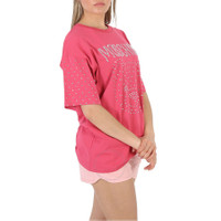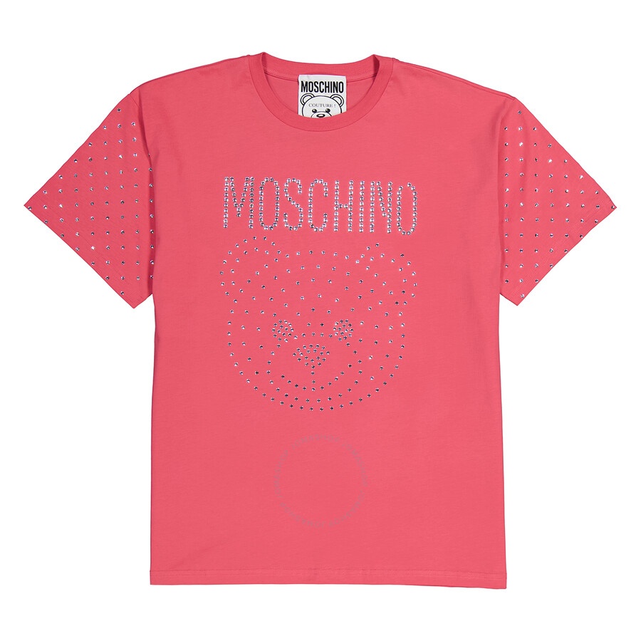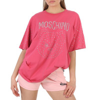 Moschino Ladies Tops. Fashion category: T-Shirts & Henleys. SKU: V0715-0541-1206. Color: Fuschia. Moschino Fuschia Crystal Teddy Bear Oversize Cotton T-Shirt. Made from 100% organic cotton, this t-shirt features a round neck, short sleeves, a straight hem, drop shoulder and detailed with synthetic crystal embellishments depicting the brand's logo and iconic Teddy Bear across the front of the design. GENERAL Color: Fuschia INFORMATION Brand: Moschino Gender: Womens Model: V0715-0541-1206 DETAILS Category: Tops Apparel Type: T-Shirts & Henleys Material: Cotton ADDITIONAL INFO Jomashop Sku: -V071505411206 Department: Apparel