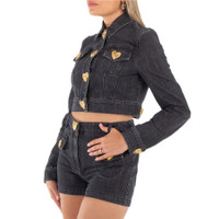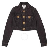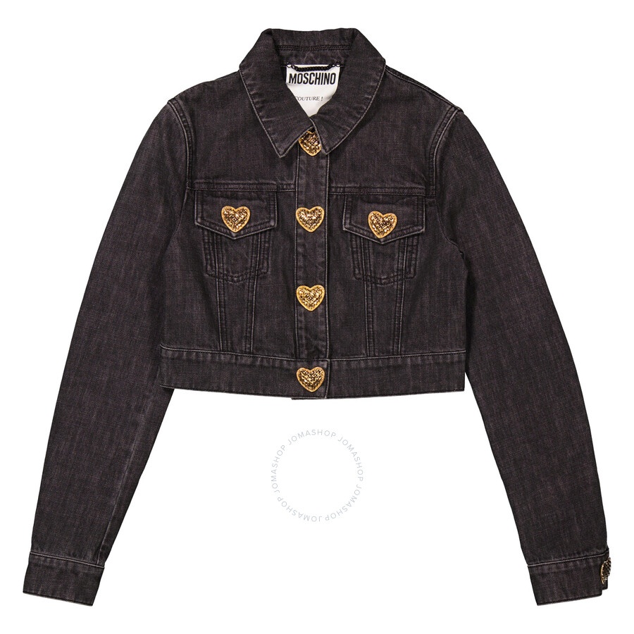 Moschino Ladies Outerwear. Fashion category: Coats & Jackets. SKU: 232D A0514. Color: Black. Moschino Heart Buttons Cropped Denim Jacket. The denim jacket features a front button fastening, long sleeves, classic collar, 2 chest patch pockets and heat button embellishments. Made in Italy. GENERAL Color: Black INFORMATION Brand: Moschino Gender: Womens Model: 232D A0514 DETAILS Category: Outerwear Apparel Type: Coats & Jackets ADDITIONAL INFO Jomashop Sku: -232DA0514BLACK Department: Apparel