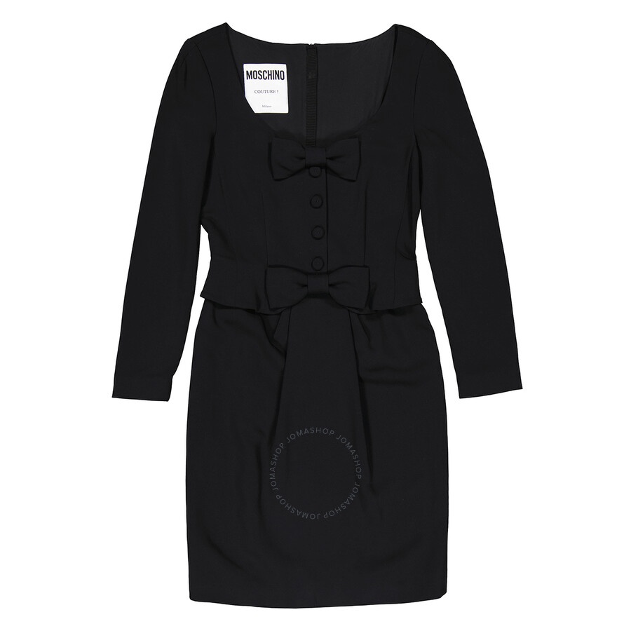 Moschino Ladies Dresses. Fashion category: Cocktail & Party Dresses. SKU: J0431-0425-0555. Color: Black. Moschino Ladies Black Crepe Bow-Embellished Mini Dress. This mini dress by Moschino features a concealed zip fastening along back, Bow detail, long sleeves, a round neckline. 89% Acetate 6% Elastane 5% Silk. Made in Italy. GENERAL Color: Black INFORMATION Brand: Moschino Gender: Womens Model: J0431-0425-0555 DETAILS Category: Dresses Apparel Type: Cocktail & Party Dresses ADDITIONAL INFO Jomashop Sku: -J043104250555 Department: Apparel